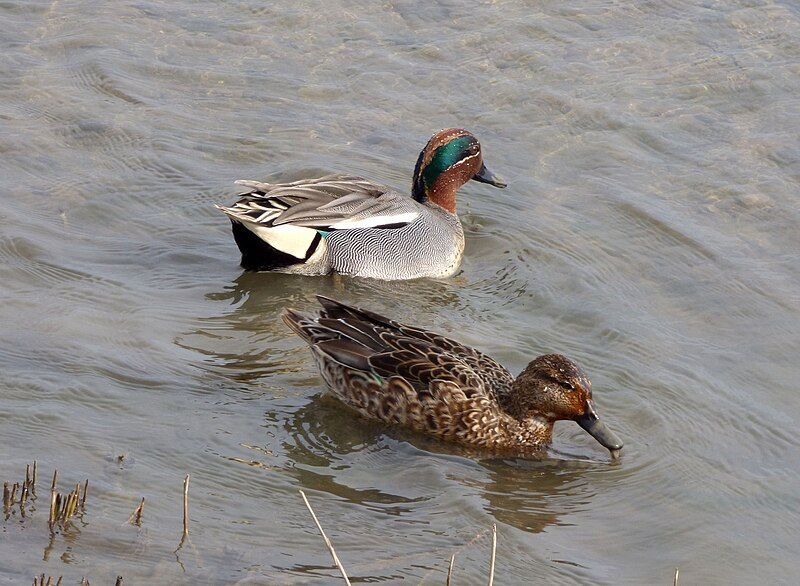 بط صغير الحجم، الأنثى مرقطة بالأسمر ومصفرة، الرقبة وأسفل الجسم باهتة أكثر، الذكر الرّأس بني نحاسي وحاجب عريض أخضر ينزل حتى أسفل الرقبة، لون الريش مائل إلى الرمادي و خط أفقي أبيض على جانبي الجسم، ويتميز بوجود بقعة مثلثة صفراء بمؤخرة الجسم، الجناح مائل إلى الرمادي مع حواف خضراء لامعة في الذكر والأنثى، ينشط في المستنقعات والبحيرات ذات المياه الحلوة قليلة العمق وكذلك بالضفاف البحرية، طيرانه سريع في مجموعات.