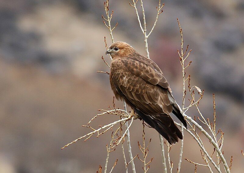 يعرف محليا باسم بو حوام – طير الخرشاني، هو طائر كبير الحجم وغير مهاجر ينتمي إلى الفصيلة البازية، يحلق على مستويات عالية لديه أجنحة طويلة والذيل قصير ويظهر بلون رمادي والأجزاء العلوية من الظهر تبدوا بلون بني والصدر رمادي مخطط بأشرطة بنية رفيعة أما البطن فتظهر بلون بني والعيون تظهر بلون عسلي غامق أما الأرجل صفراء طويلة، يتغذى على الحمام والطيور الصغيرة والقوارض والسحالي الكبيرة والثعابين والقنافذ وأحيانا بعض الحشرات كالخنافس، ويبني عشه على جوانب المنحدرات الصخرية الوعرة وتضع الأنثى ثلاث بيضات.