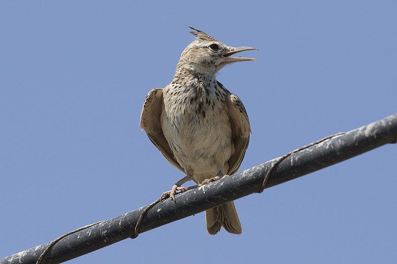 من الطيور الشائعة والمتوطنة في ليبيا وتعرف محلياً باسم قنبيرة، أهم ما يميزها العرف(التاج) على رأسها، الجزء العلوي للجسم بني مع وجود بعض البقع السوداء، بينما الجزء السفلي بني(باهت) مائل للأبيض، ذيلها وأرجلها قصيران، تتغذى على البذور والحبوب، تبني عشها عادة على الارض تضع الأنثى من 2-5 بيضات.