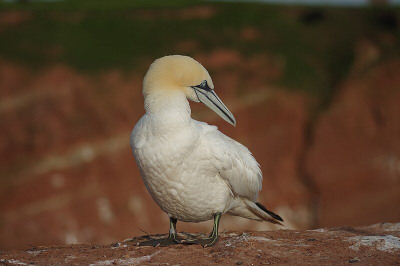طائر حجمه الكبير، لونه الأبيض رأسه أبيض مصفر وأجنحته طويلة ذات أطراف السوداء، المنقار رمادي مائل للأزرق والسيقان سوداء، يتواجد بعرض البحر يقترب من السواحل والشواطئ، ينشط منفرد أو في مجموعات صغيرة.