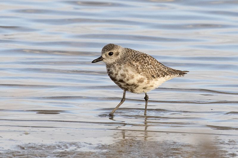 طائر متوسط الحجم، سطح الجسم رمادي مخطط بالأبيض والأسود، الجزء السفلى أبيض اللون، المنقار قصير أسود اللون والساق سوداء، يتواجد في مجموعات صغيرة على السواحل.