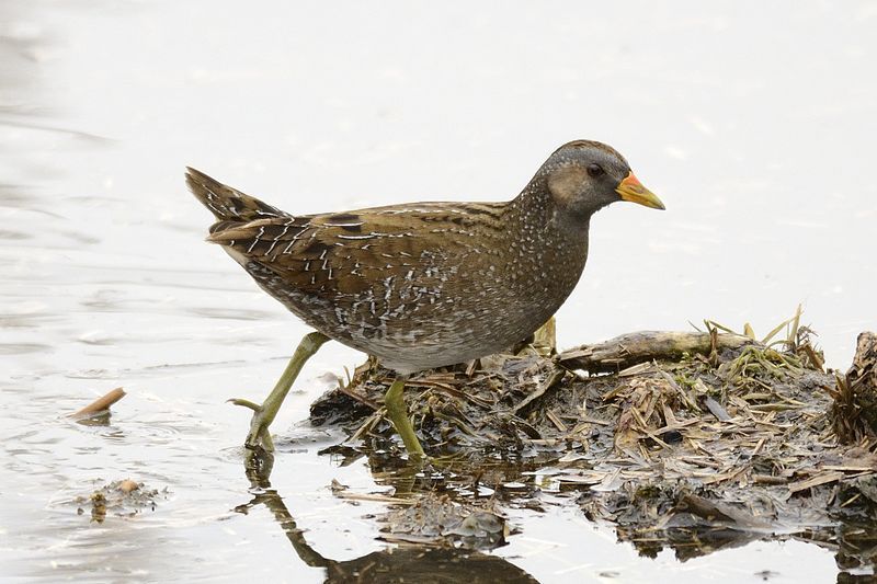 الأجزاء العلوية سمراء وبنية داكنة مبقعة، الأجنحة سمراء داكنة، الصدر رمادي منقط بالأبيض، جانبي الجسم مخططة، الساق مخضرة، المنقار قصير أخضر مصفر عند القاعدة وأحمر عند المنبت، يتواجد في المناطق الرطبة خاصة المستنقعات والسهول.