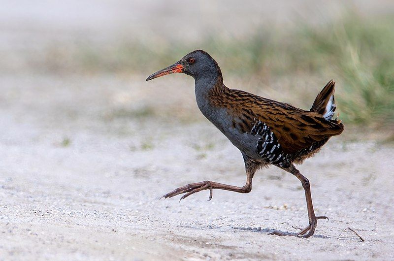 طائر متوسط الحجم، السطح بني مائل للأسود الوجه والأجزاء السفلية رمادي مائل للأزرق، جوانب الجسم مخططة بالأبيض والأسود وأسفل الذيل أبيض، المنقار أحمر طويل ونحيف، المستنقعات والبرك قليلة العمق ذات النباتات الكثيفة.