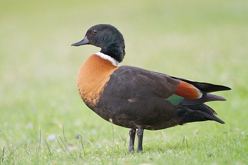 هو بط ضخم، ريشه ذهبي مائل للبرتقالي بأكمله، الرّأس لونه بني فاتح، أطراف الأجنحة والذيل ذات لمعان أخضر، ولديه بقعة صغيرة خضراء في الجزء الأوسط من الجناح، ينشط في البحيرات والمستنقعات ومجاري المياه ومنحدرات الجبال الشواطئ الصخرية، طيور نفورة جدًا خلال فترة التزاوج وهي أحادية الأزواج.