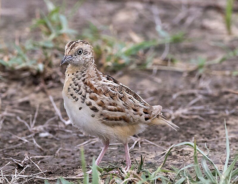 الإناث الأكبر حجم من الذكور، الجزء العلوي مرقط بالأسود والرمادي والبني المحمر يتميز بوجود خط أصفر فاتح على طول منتصف الرأس وخطوط صفراء على طول جانبي، العنق والبطن أبيضان والصدر كستنائي محمر، يتواجد في التربة الرملية الجافة وفي الشجيرات الصغيرة والأراضي المزروعة.