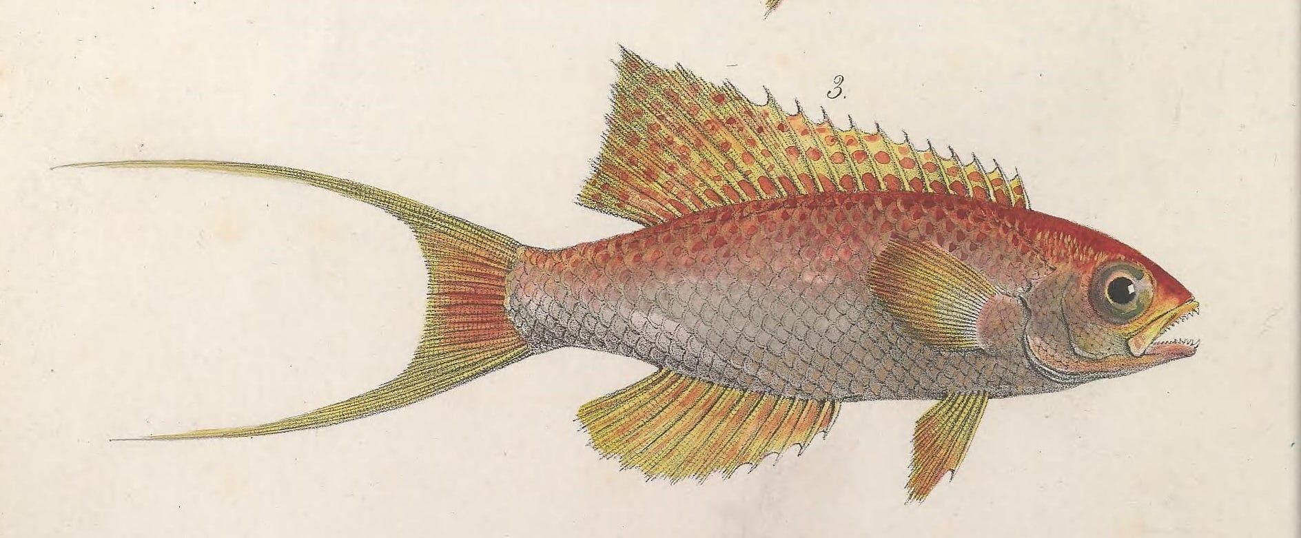 وردي أحمر ، والزعانف صفراء.الجسم طويل، وطوله القياسي أطول من عرضه بثلاث مرات. تتكون الزعنفة الظهرية من 10 أشواك ومن 10 إلى 11 شعاعاً، والجزء الشعاعي أطول بكثير من الجزء الشوكي ، وللزعنفة الشرجية 3 أشواك ومن 9 إلى 10 أشعة والزعنفة الحوضية قصيرة، كما أن فصوص الزعنفة الذيلية طويلة وخيطية والخط الجانبي غير مكتمل وينتهي بعد الزعنفة الظهرية بقليل.
