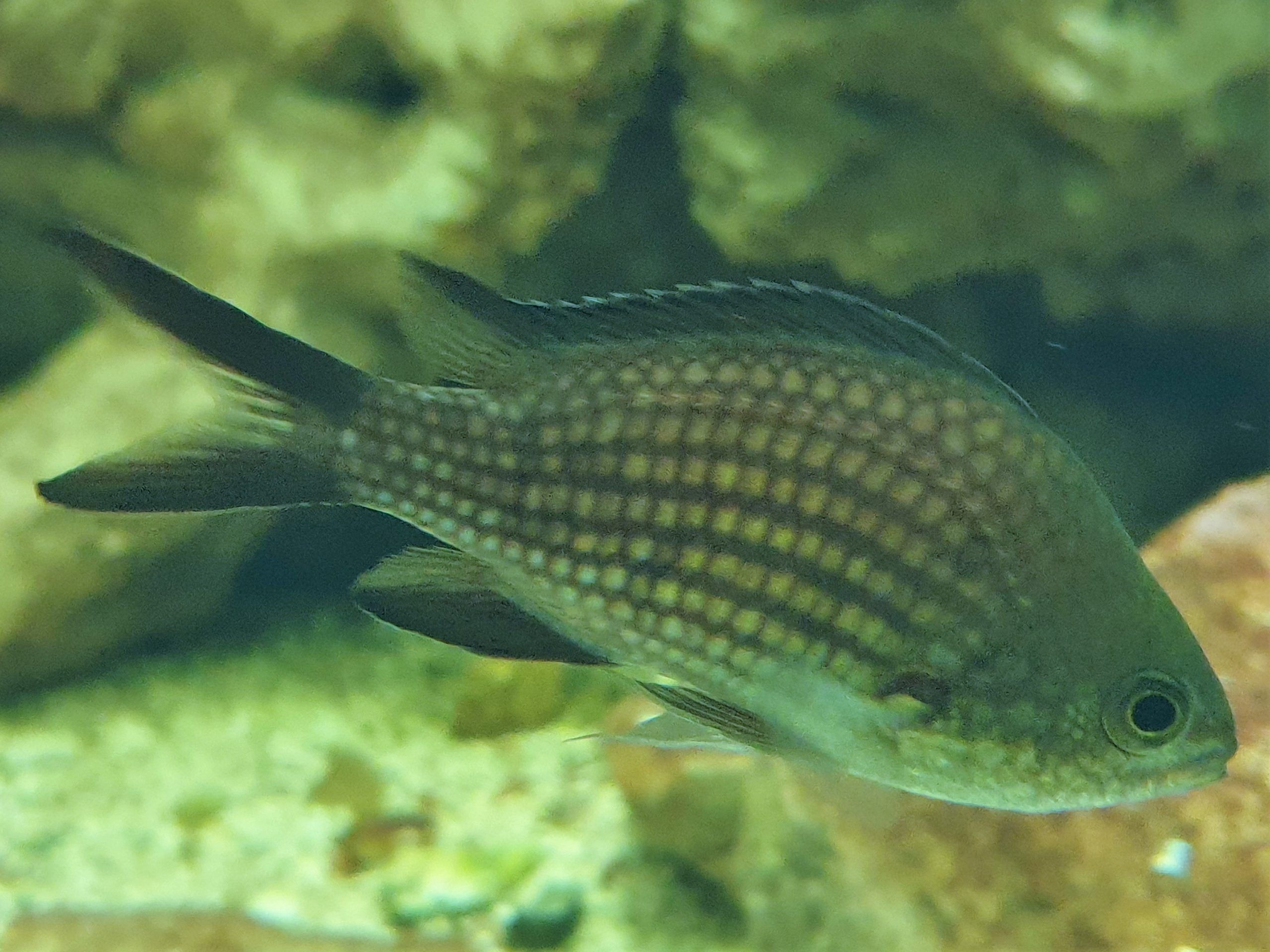 بني غامق على كامل الجسم ومركز كل قشرة بني غامق وحاشية الزعنفة الذيلية غير ملونة.الجسم بيضوي ومفلطح قليلا والرأس قصير والعينان كبيرتان والفم صغير والأسنان صغيرة حيث تشكل 3 صفوف على كلا الفكين وللزعنفة الظهرية من 13 إلى 14 شوكة ومن 10 إلى 11 شعاعاً. كما أن للزعنفة الشرجية شوكتين و من 1 إلى 10 شعة. والقشور كبيرة وتغطى كامل الجسم والرأس.