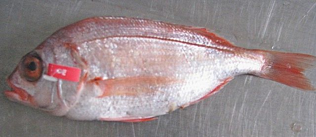 أحمر وردي والأشواك الظهرية وحاشية الزعنفة الشرجية والجزء الخلفي من السفلى للزعنفة الذيلية جميعها بيضاء. الجسم مستطيل مضغوط من الجانبين، والجزء العلوي من الرأس متدرج الانحناء، والعينان كبيرتان، والفم صغير به صفوف عدة من الأنياب الخارجية القوية، والأنياب السفلية أصغر من الأنياب العلوية، وتتكون الزعنفة الظهرية من 11 إلى 12 شوكة ومن 10 إلى 11 شعاعاً، كما أن أربع أو خمس الأشواك الأولى تزداد طولاً تدريجياً، يوجد 3 أشواك و 8 أشعة بالزعنفة الشرجية، من 17 إلى 20 شوكة خيشومية على القوس السفلى