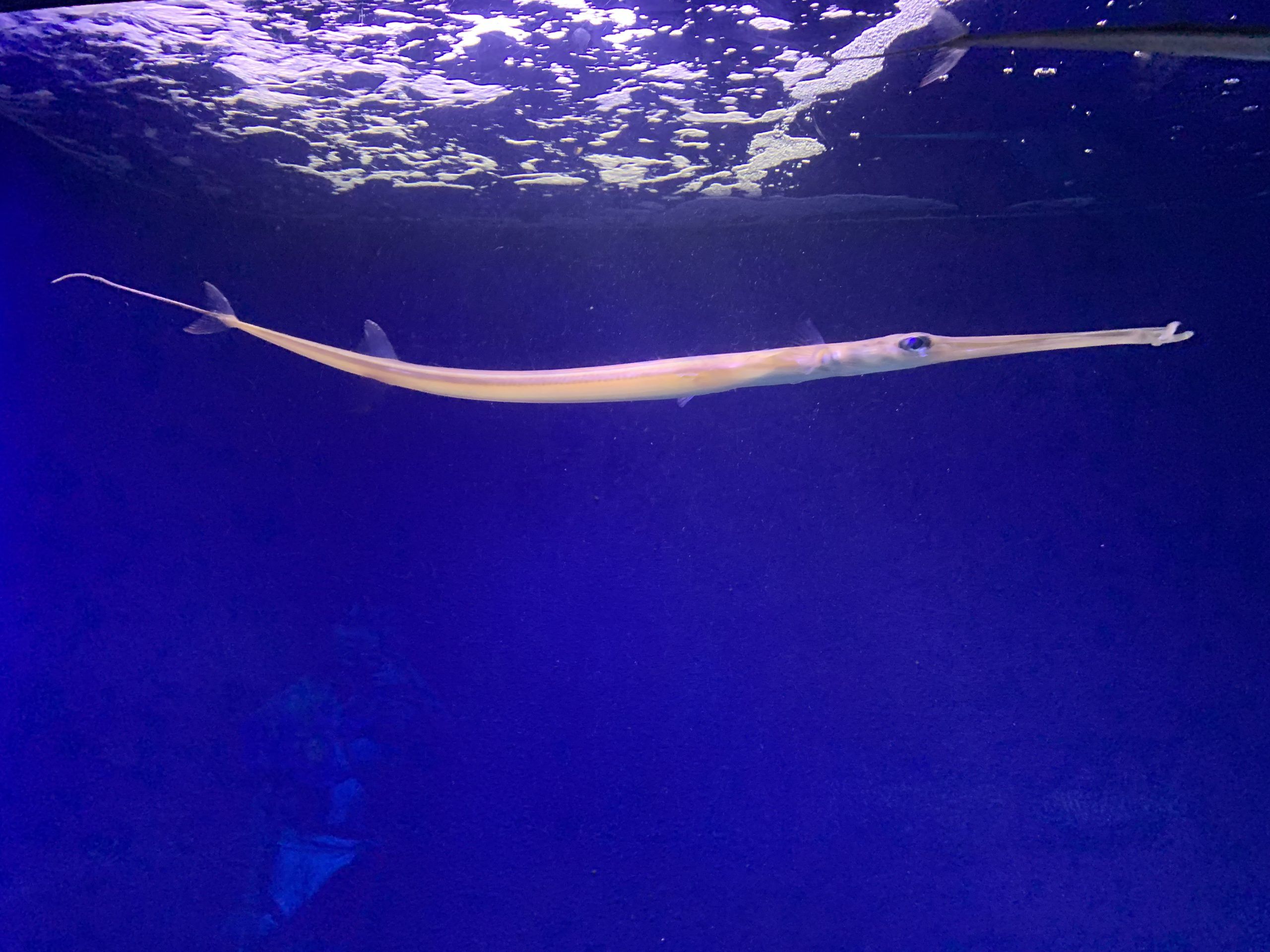 رصاصي إلى الأخضر الزيتي على كامل الجسم.الجسم طويل وغليظ ومضغوط قليلا من الأعلى والرأس طويل ويمثل ثلث الطول القياسي. والخطم طويل على هيئة أنبوب والزعنفتان الظهرية والشرجية خلفيتان ومتقابلتان ومتساويتان فى الحجم. وللزعنفة الظهرية 15 شعاعاً. وللزعنفة الشرجية 14 شعاعاً. الشعاعان الأوسطان للزعنفة الذيلية طويلان.