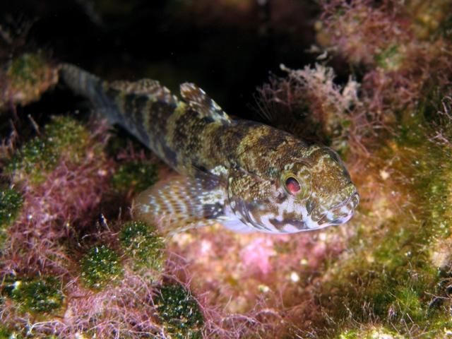 بقع بنية غامقة على الجسم. والحاشية العلوية للزعنفة الظهرية الأولى غامقة. والذكور في موسم التكاثر يتغير لونها إلى البني البنفسجي مع تغير في لون الحاشية العلوية للزعنفة الظهرية إلى الأصفر أو البرتقالي. الجسم رفيع أسطواني. والعيون علوية. وتوجد زعنفتان ظهريتان للأولى 6 أشواك وللثانية شوكة واحدة ومن 13 إلى 14 شعاعاً. وللزعنفة الشرجية شوكة واحدة ومن 11 إلى 12 شعاعاً. والزعنفتان الذيلية والصدرية دائريتان
