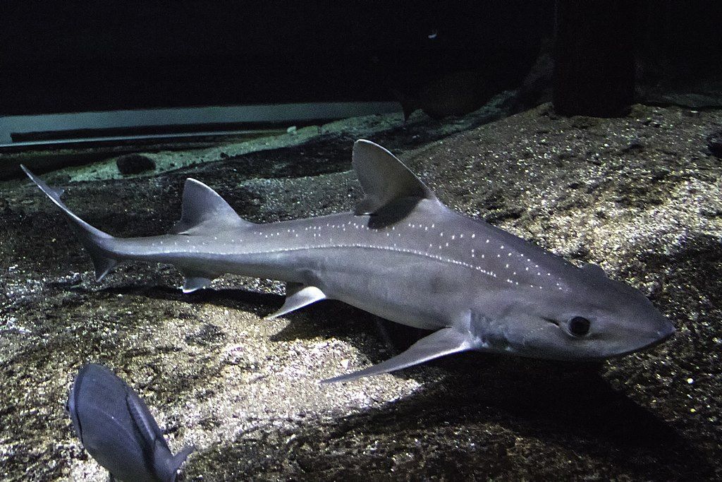 رمادي إلى رمادي بني على الظهر وفاتح على البطن، توجد العديد من البقع البيضاء الصغيرة على الجانبين والظهر.الجسم شبه أسطواني، الرأس صغير، الخطم ،دائري العينان بيضاويتان وكبيرتان نسبياً، الأسنان صغيرة وغير متناسقة، الزعانف الظهرية لها حافة خلفية غامقة ، الزعنفة الظهرية الثانية أصغر من الأولى، الزعانف الصدرية عريضة ومثلثة.