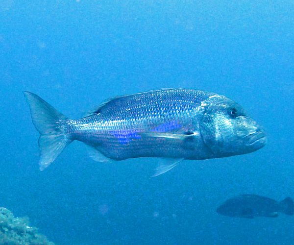 رصاصي بني من أعلى وفضي أبيض من أسفل، لون طرفي الزعنفتان الظهرية الأولى والذيلية سوداوان، ولون الزعانف الظهرية الثانية والصدرية والذيلية أصفر.الجسم مغزلي طويل، والفكان طويلان والجزء الأمامي من غطاء الخياشيم مغطى كليا بالقشور وحاشيته مقعرة. وقاعدة الزعنفة الحوضية أمام الزعنفة الظهرية، والزعنفة الصدرية فوق الزعنفة الحوضية وطرفا كلتا الزعنفتين يصلان إلى مستوى قاعدة الزعنفة الظهرية الأولى.