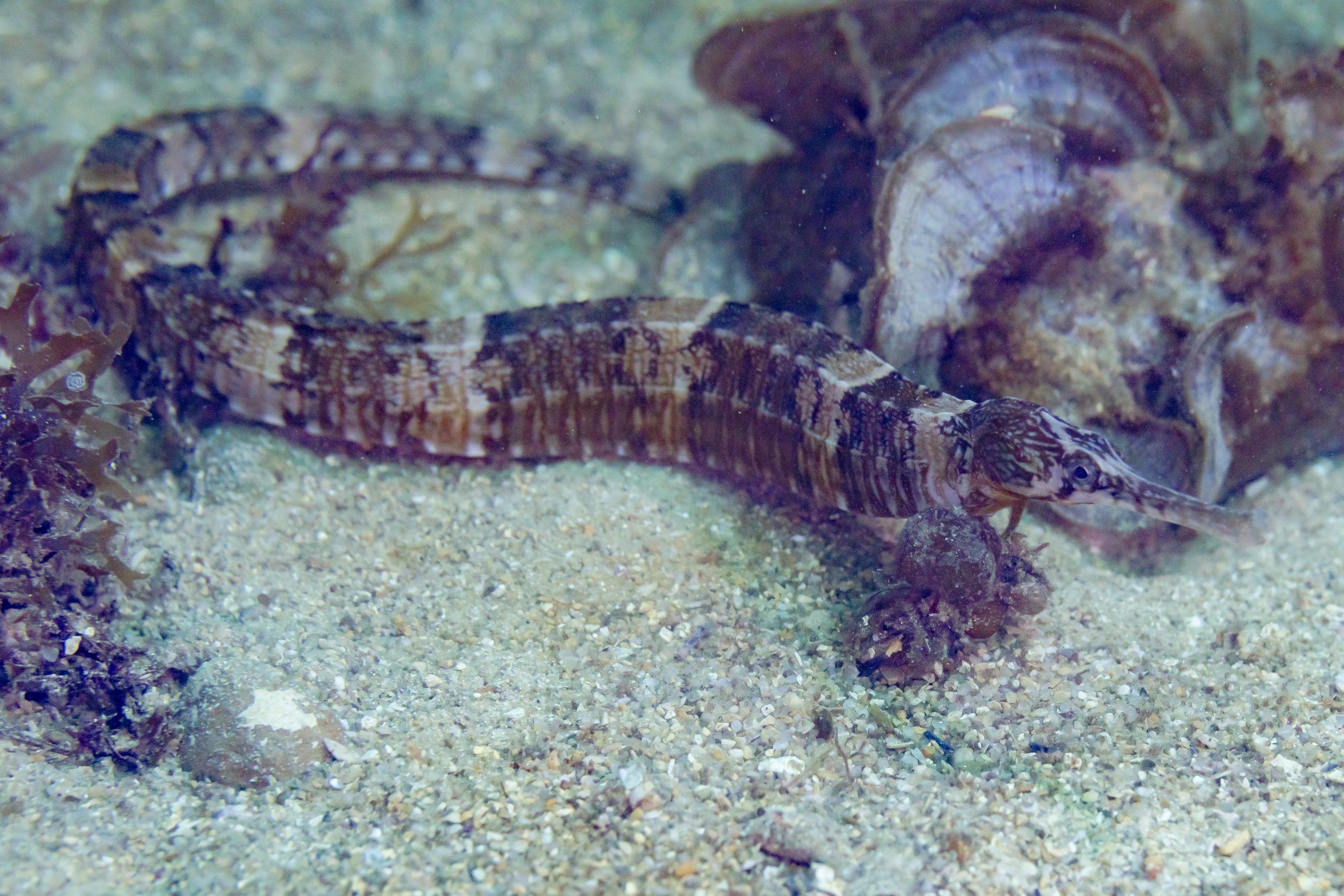 أخضر إلى بني على الظهر والجانبين. وهناك حلقات غامقة على امتداد الجسم. والبطن بني باهت، والزعنفة الظهرية مبقعة بالبني الباهت.الجسم طويل ورفيع جدا ومصفح بصفائح جلدية على هيئة سلسلة من الحلقات. والرأس محدّب خلف العيون والفم صغير، والخطم طويل على هيئة أنبوب الحلقات التى ما قبل بداية الزعنفة الظهرية من 17 إلى 21 حلقة يمكن تمييزها عن الحلقات التى بعدها من 34 إلى 38 حلقة وللزعنفة الظهرية 34-45 شعاعاً ومن 8 إلى 10 حلقات . وللزعنفة الصدرية من 1.1 إلى 15 شعاعاً. وللزعنفة الذيلية 10 أشعة