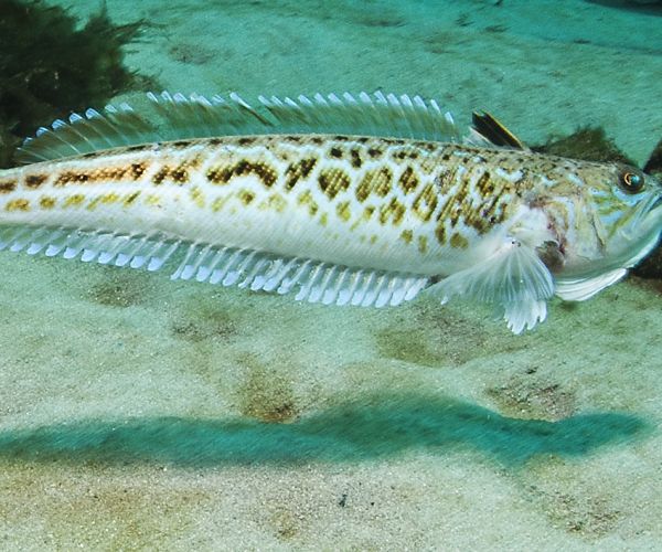 توجد 8 بقع غامقة على هيئة أسرجة على امتداد الظهر .الجسم طويل، أسطواني رفيع. والرأس عريض ومضغوط قليلا ومتجعد من الأعلى والفم كبير والأسنان صغيرة وحادة وترى عندما يكون الفم مغلقا. وقطر العين يساوى من 5 إلى 8 أمثال طول الرأس لها زعنفة ظهرية واحدة بها من 11 إلى 13 شعاعاً. وزعنفة ذهنية صغيرة على الظهر مقابلة للزعنفة الشرجية وللزعنفة الشرجية من 9 إلى 12 شعاعاً. وللزعنفة الصدرية من 12 إلى 14 شعاعاً . وللزعنفة الحوضية 8 أشعة، والأشعة الداخلية أطول بقليل من الأشعة الخارجية