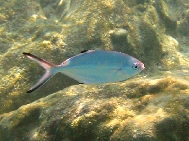 أخضر غامق على الظهر وفضي على البطن. وهناك من 3 إلى 5 بقع غامقة بيضوية على جانبي الجسم ونصف حافتي فصي الزعنفتين الظهرية والشرجية أسود. طرفي الزعنفة الذيلية أسودان.الجسم ،عريض ومضغوط من الجانبين لها أسنان على كلا الفكين على هيئة صفـ ضيق من الأمام وتتناقص من الخلف و 6 أشواك بالجزء الأمامي للزعنفة الظهرية وشوكة واحدة ومن 23 إلى 27 شعاعاً. وشوكتان بالزعنفة الشرجية يتبعها شوكة واحدة ومن 22 إلى 25 شعاعاً . وقاعدتا الجزء الشعاعي للزعنفتين الظهرية والزعنفة الشرجية متساويتان. والزعنفة الصدرية أطول من الزعنفة الحوضية. كما أن الخط الجانبي مقوس قليلا فوق الزعنفة الصدرية.