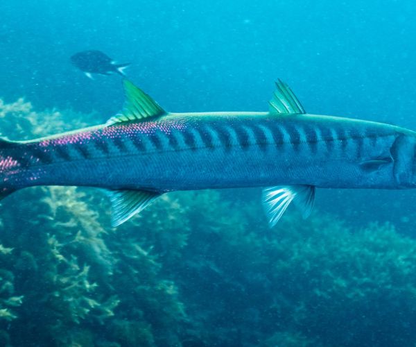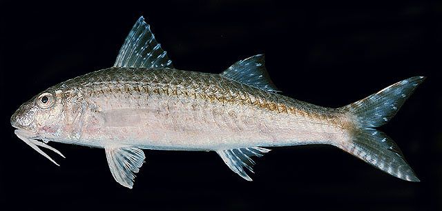 الظهر والجانبان مزركشان باللون الأحمر البني، والبطن بيضاء. و 3 إلى 7 خطوط بنية حمراء بالفص العلوي للزعنفة الذيلية و 6 إلى 7 خطوط بالفص السفلى. الجسم طويل ومضغوط قليلا من الخلف، وتوجد أسنان على كلا الفكين واثنان من الزوائد على هيئة شوارب. وزعنفتان ظهریتان حيث الشوكة الأولى بالزعنفة الظهرية الأولى أطول من بقية الأشواك