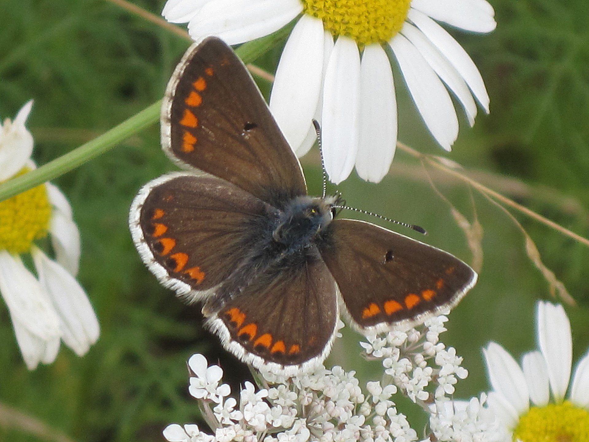 على عكس معظم الفراشات الزرقاء الأخرى، فإن هذه الفراشة لا تحتوي على قشور زرقاء على الجهة العلوية من أجنحتها، حيث يكون كلا الجنسين بشكل رئيسي بني اللون، كما يوحي اسمها الشائع. ومع ذلك، تظهر الفراشة بريقًا أزرق عندما تكون في زوايا معينة بالنسبة للضوء.كلا الجنسين لهما بقع برتقالية جميلة على الجهة العلوية من كلا جناحيها الأمامي والخلفي، مما يضيف إلى جمالها الفريد.