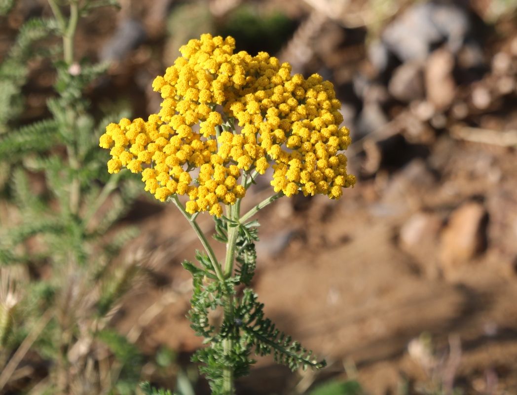 Achillea arabica Kotschy/ Heterotypic Synonyms: Achillea biebersteinii Afanasiev, it is a perennial plant, up 25-60 cm tall. Stems striate, tomentose to glabrescent. Leaves, basal and lower cauline bipinnatisect, 3-10 × 1-3 cm, segments linear-lanceolate, acute; upper cauline leaves pinnatisect, smaller, sessile. Inflorescence & flowers; corymbs compact, 2-6 cm across, with 50-150 capitula; peduncles short (1-3 mm). Involucre 3-3.5 × 2-2.5 mm, oblong to obovoid, bracts hairy, narrowly scarious on margin. Ligules 4-6, white; disk florets 5-15. Fruit, achenes small, oblong, glabrous.