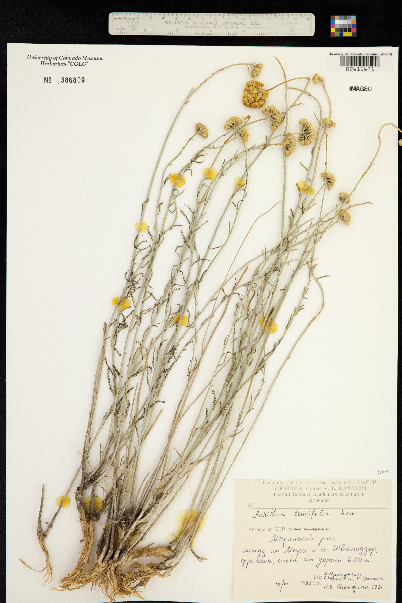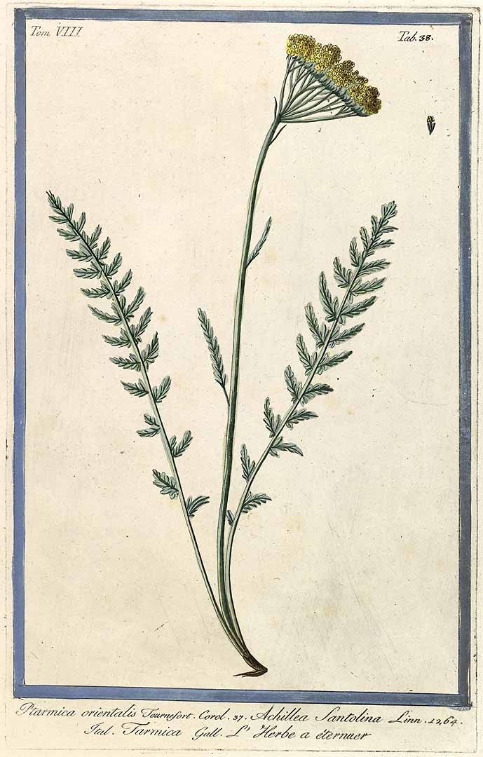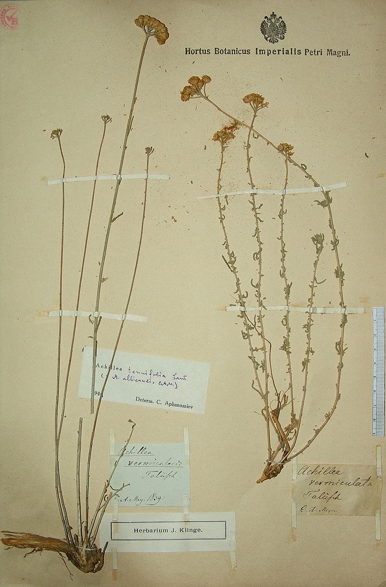 Achillea tenuifolia Lam. / Heterotypic Synonyms: Achillea santolina L., it is a perennial plant, up to 10-20 cm, with simple or branched, greenish-canescent stems. Leaves pubescent, with tripartite segments, segments of lower leaves and those of young shoots somewhat distant. Corymbs compound; peduncles c. 5 mm long, thickened. Capitula c. 5 mm long, ovoid; involucral bracts oblong, obtuse. Ray florets yellow, very short, erect.