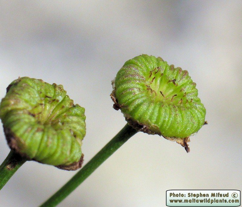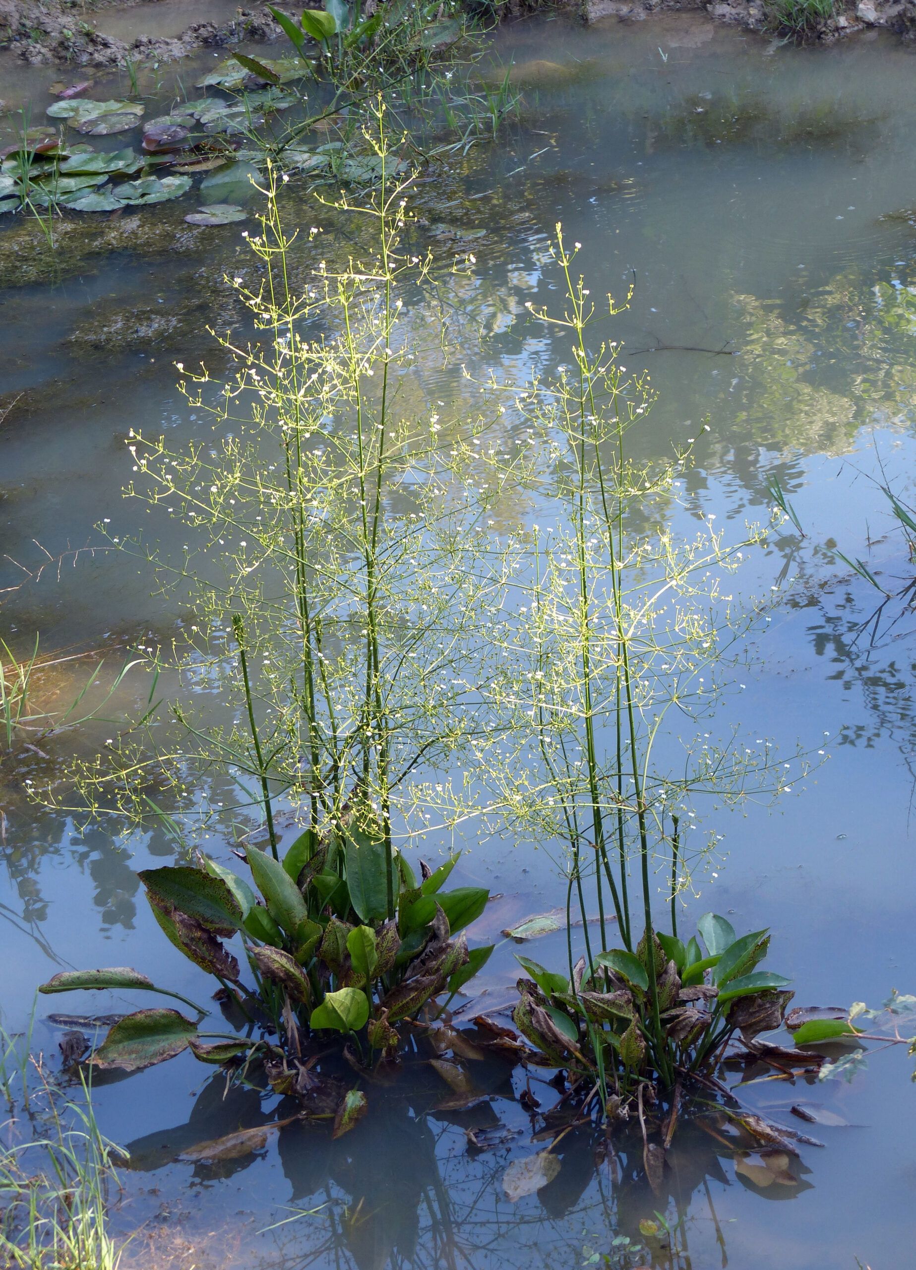 Alisma plantago-aquatica L., it is a perennial or helophyte, aquatic herb. Peduncle (2–)6–10 cm high. Inflorescence of about 6 whorls of branches and flowers; bracts membranous, lanceolate, those of the lowest whorl 1–2 × 0.5 cm., with several smaller bracteoles. Pedicels up to 2 cm. long. Sepals ovate, 2 mm. long. Stamens 2 mm. long; anthers 0.75 mm. long, narrow; filaments attached above the base. Petals 4 mm. long, white, delicate. Achenes broadly ovate, with 2 or 3 ridges on the dorsal surface, pale brown to yellowish. Carpels ovate, compressed, less than 1 mm. long; style about 1 mm. long, erect or slightly curved.
