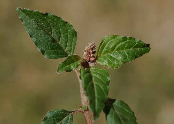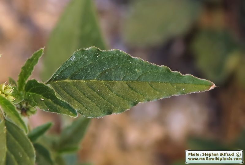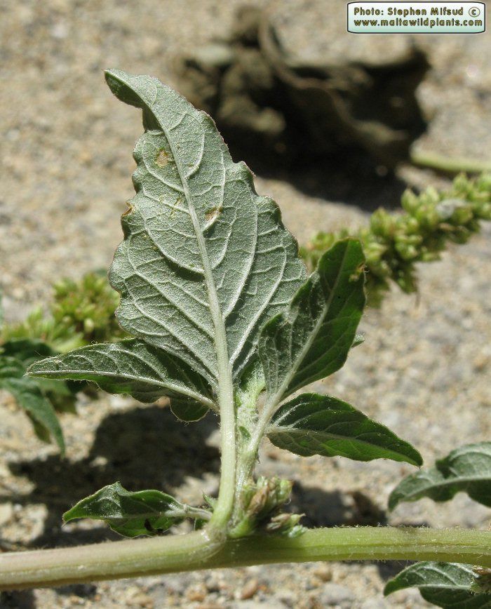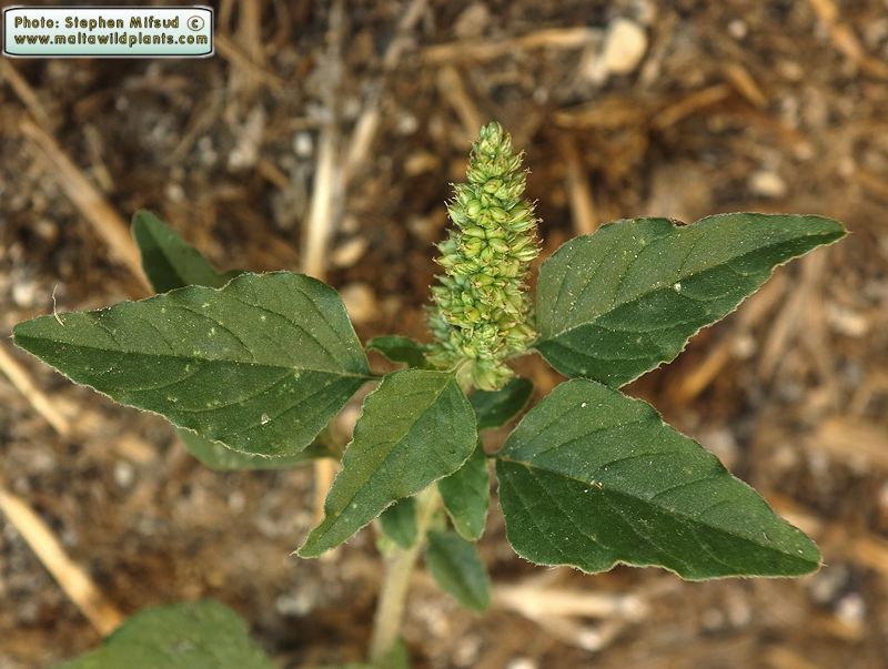 Amaranthus deflexus L., it is a procumbent perennial plant, up to 40 cm, densely puberulent in the upper part. Leaves 3-5 cm, rhombic-ovate, obtuse; margin finely undulate. Inflorescence usually dense, terminal, spicate, becoming interrupted and leafy towards the base. Bracteoles 1/3-1/2 as long as the perianth, ovate, wide at the base, mucronate. Perianth-segments 2 or 3, 1.2-1.5 mm, linear to oblong-spathulate. Capsule ellipsoid, sometimes constricted above, 1.75-3 mm, obviously exceeding the perianth, scarcely compressed, smooth, indehiscent or irregularly rupturing at maturity. Seeds compressed-ellipsoid, c. 1-1.2 x 0.7-0.8 mm, black, shining and almost smooth, with a duller, slightly roughened border.