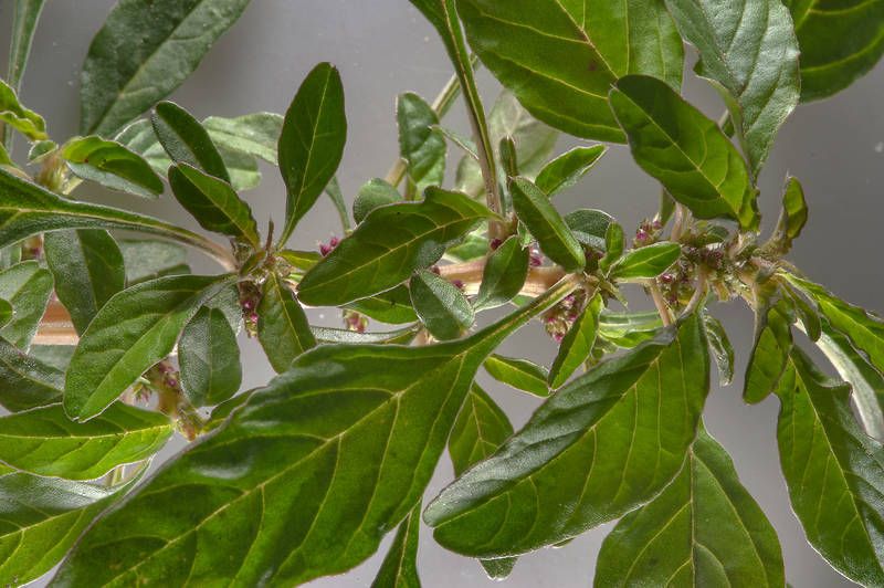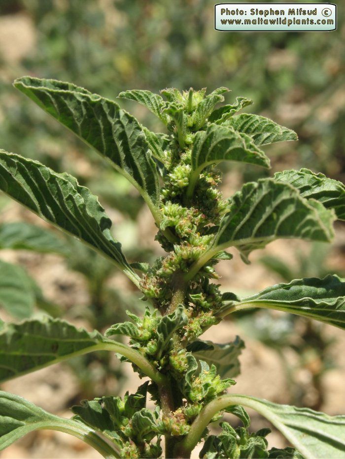 Amaranthus graecizans L., it is an annual herb, pubescent in distal parts or becoming glabrescent at maturity. Stems erect to ascending or decumbent, branched at or distal to base, 0.1-0.9 m. Leaves: petiole variable in length; blade lanceolate to nearly linear or rhombic-ovate to elliptic-ovate, (1.5-)2-4(-5) × 1-3 cm, base cuneate to broadly cuneate, margins entire, plane, rarely indistinctly undulate, apex subacute to obtuse or emarginate, mucronulate. Inflorescences axillary glomerules, green. Bracts lanceolate, sub spinescent, 1.5-2 mm, shorter or slightly longer than tepals. Pistillate flowers: tepals 3, erect, elliptic to lanceolate-elliptic, equal or subequal, 1.5-2 mm, apex short-acuminate; style branches slightly spreading; stigmas (2-)3. Staminate flowers intermixed with pistillate; tepals 3, equal or sub equal; stamens 3. Utricles sub globose to broadly elliptic, 2-2.5 mm, slightly rugose, dehiscence regularly circumscissile, rarely irregularly dehiscent. Seeds black, lenticular, 1-1.3(-1.6) mm diam., smooth or indistinctly punctate.
