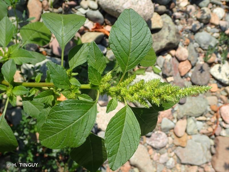 Amaranthus hybridus L., it is an annual plants glabrous or glabrescent, or distal parts of stem and branches slightly pubescent when young. Stems erect, green or sometimes reddish purple, rarely under-developed plants ascending, branched to nearly simple, 0.3-2(-2.5) m. Leaves: petiole 1/2 as long as to equaling blade; blade ovate, rhombic-ovate, or lanceolate, (2-)4-15 × (1-)2-6 cm, base cuneate to broadly cuneate, margins entire, apex acute to obtuse, with mucro. Inflorescences terminal and axillary, erect or reflexed, occasionally nodding, green or olive green, occasionally with silvery or reddish purple tint, leafless at least distally, terrminal inflorescence often slightly nodding with numerous shorter branches at base. Bracts lanceolate-linear to subulate, 2-3.5(-4) mm, subequal to or 2 times as long as tepals, apex spinescent. Pistillate flowers: tepals 5, lanceolate to lanceolate-linear, subequal or unequal, 1.5-3 mm, membranaceous, apex acute or acuminate, gradually narrowing into aristate tip; style branches erect, shorter than body of fruit; stigmas 3. Staminate flowers at tips of inflorescences; tepals 5; stamens (4-)5. Utricles obovoid or elongate-ovoid, 1.5-2.5 mm, shorter than tepals, smooth proximally, lid verrucose or rugose, dehiscence regularly circumscissile, or rarely in some presumably hybrid forms, irregularly dehiscent or indehiscent. Seeds black to dark reddish brown, lenticular to lenticular-globose, 1-1.3 mm, smooth, shiny.