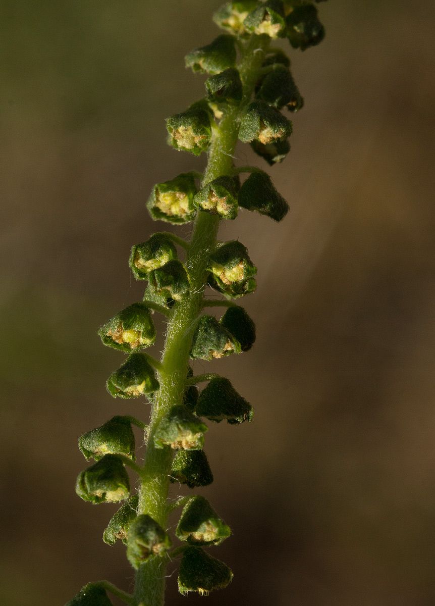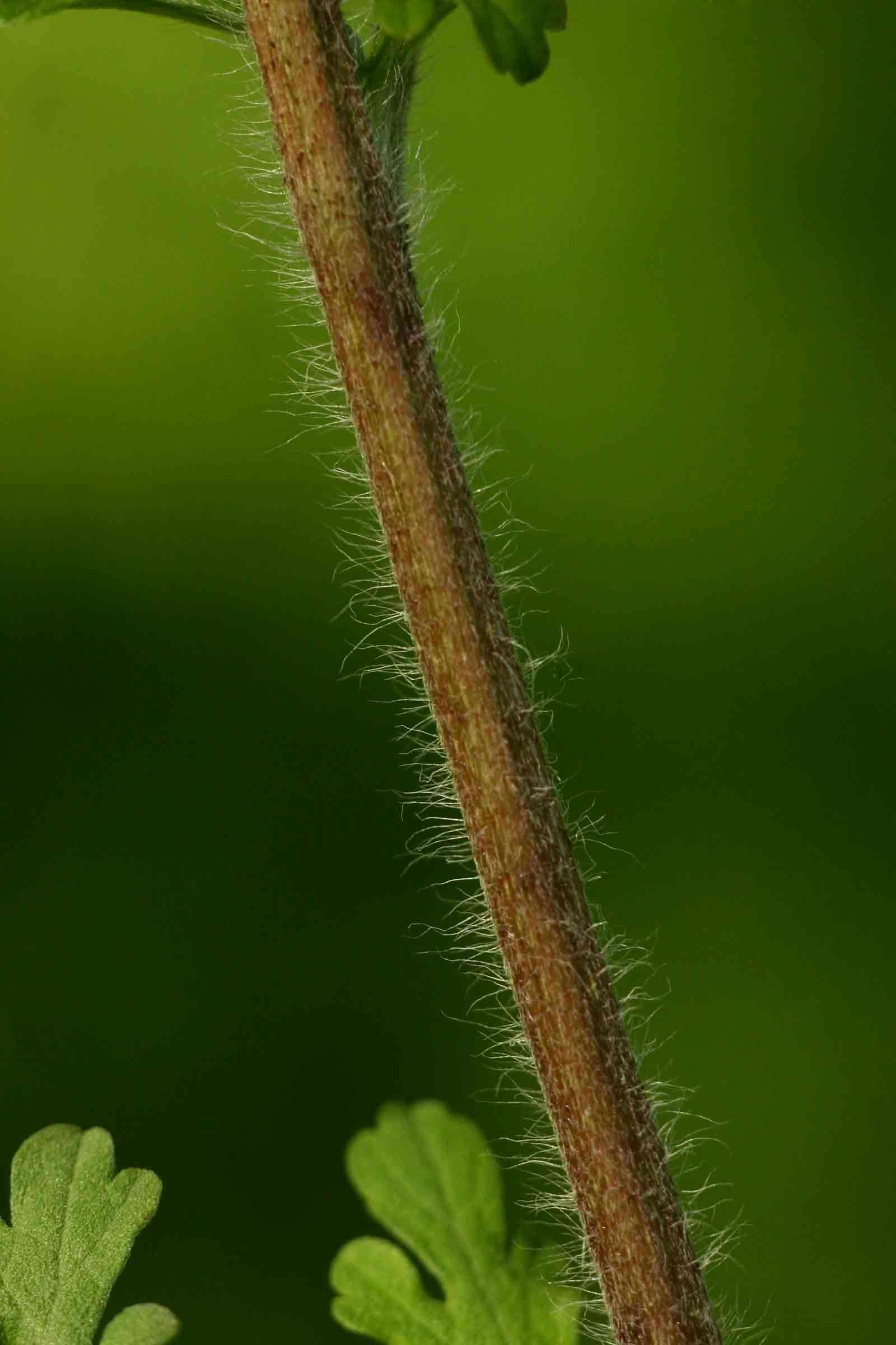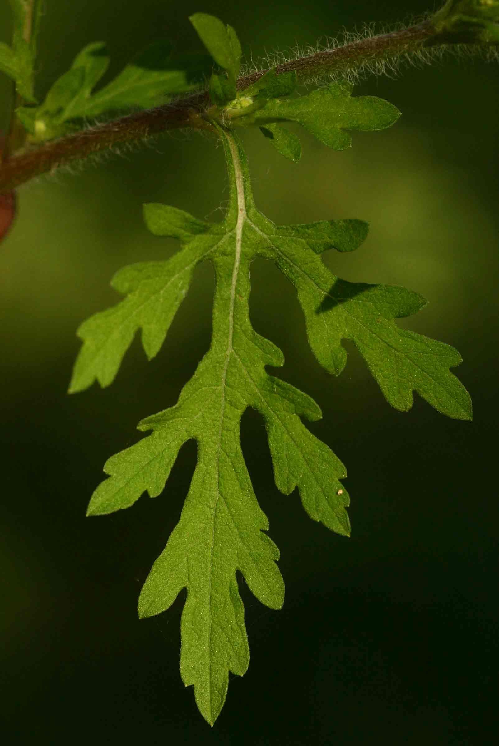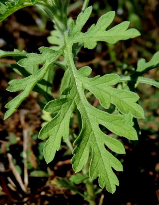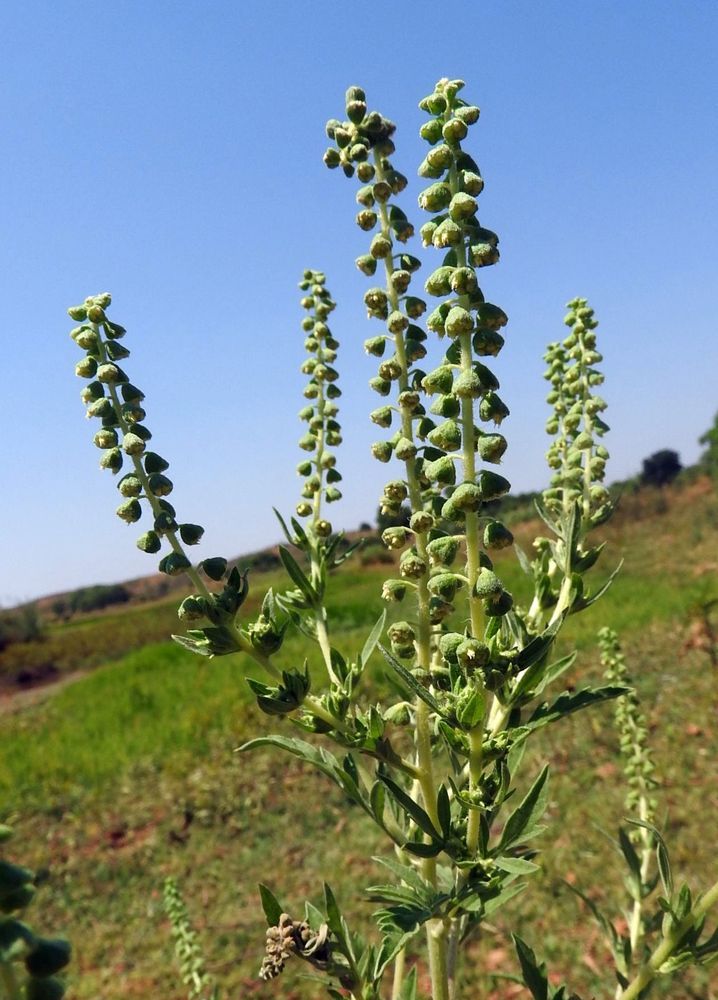 Ambrosia maritima L., it is an annual plant, up to 20-60 cm tall, hairy-cane-like, with a penetrating odor. Branched stem, densely hairy. Leaves ash-green above, whitish-hairy below, petiolate, oval in their outline, bipinnatipartite or pinnatipartite, with pinnatifid segments, with obtuse lobes.  Inflorescences are in spikes or terminals racemes formed by small capitulums of two types: Male sessile capitulums or slightly stalked and bending, about 3 mm in diameter with an obconical-campanulate involucre; female sessile capitulums, solitary or in clusters on the axils of upper leaves. Involucre of female capitulums have some short, thick spikes on the top, extended like a beak around the style and tightly wrapping the smooth obovoid.  Fruits small (4 mm long), almost as wide as long, grooved-rugose, with towards the middle a whorl of 4-6 short spreading-erect spines, almost truncate at the top, ending in a slightly bifid beak.
