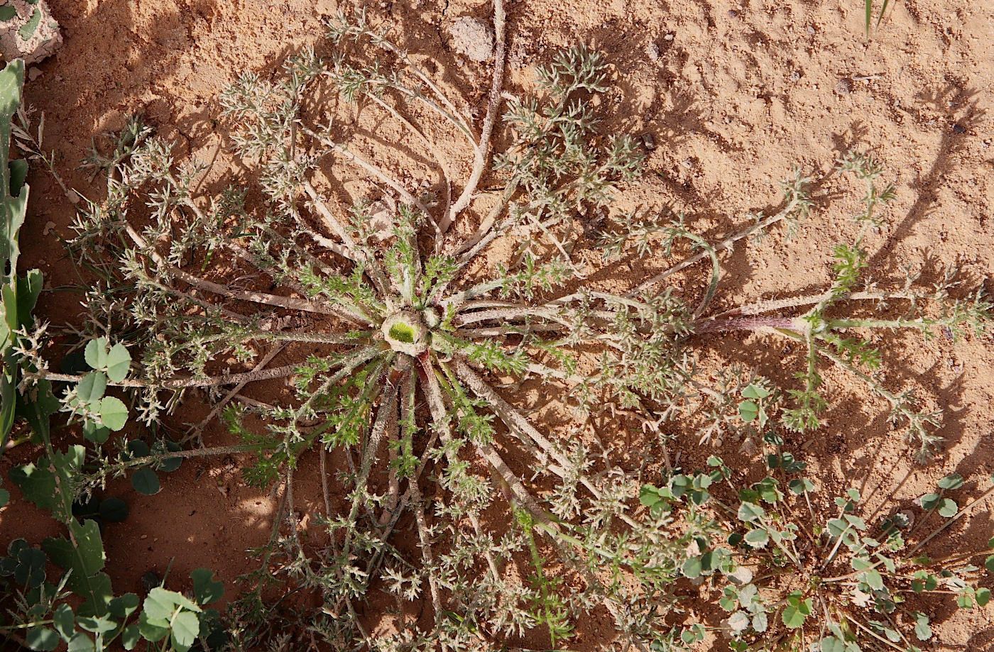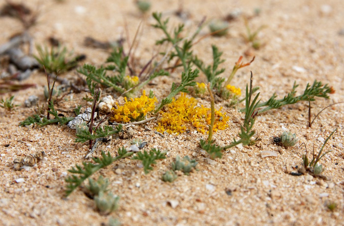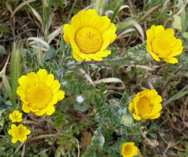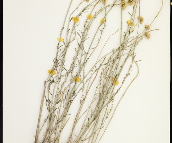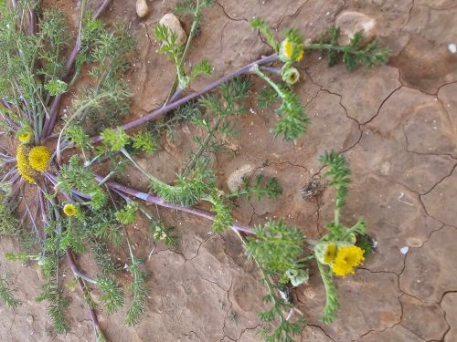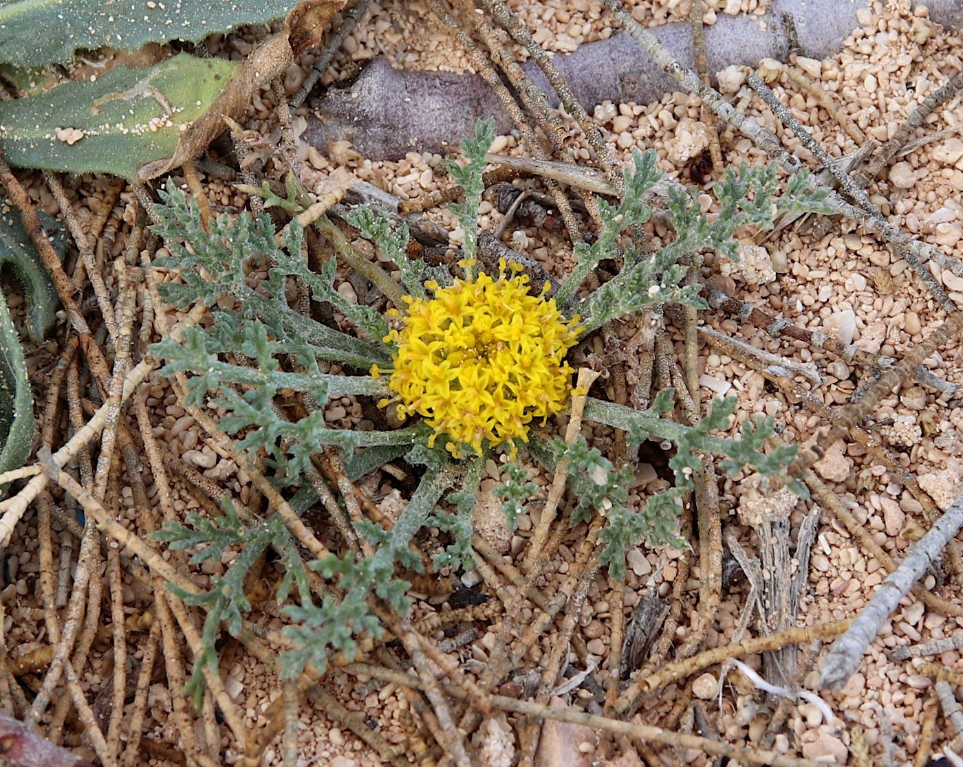 Anacyclus monanthos (L.) Thell. / / Accepted Infraspecifics: Anacyclus monanthos ssp. monanthos , Anacyclus monanthos ssp. cyrtolepidioides (Pomel) Humphries / Homotypic Synonyms: Anacyclus cyrtolepidioides Pomel, it is an annual herb up to 35 cm long, rosetted greyish-villous, sub caulescent or acaulescent, with prostrate branches arising in the axils of leaves of the rosette below the cluster of 1 (-few) terminal capitula. Rosette leaves up to 50 X 20 mm, petiolate, obovated in outline. tripinnatisect; leaf-segments linear-lanceolate, acute with short, terminal mucro; petiole and rachis flattened. Cauline leaves similar. sessile. Capitula 10-15 mm in diam., homogamous, discoid, yellow; peduncles when present sub clavate after anthesis. Outer involucral bracts 5 x 1mm, greenish, narrowly ovate, acute, with narrow, whitish or brownish scarious margin, surface on dorsal side sericeous villous. Inner involucral bracts 5 x 2 mm, greenish, oblong-ovate, with 0.25 mm wide, whitish or brownish scarious margin, with a searious, acute, 0.25 mm long. terminal appendage, dorsal surface sericeous villous. Palea 4-5 x 2.5 mm, obovate-cuneate, acute to acuminate, ± coriaceous, margins broadly scarious, apex with a dark green spot, on back & margin hairy. Florets all tubular. Corolla tube 4 mm long (incl. lobes), 5 lobed (lobes 1 mm long), tube in the lower half dorsoventrally compressed, but not winged, constricted in the middle, above the middle broadly campanulate; lobes equal, usually with apical appendages; appendages equal or unequal. Cypsela of peripheral florets 2-2.25 x 1.75-2 mm, dorsoventrally compressed, obconical in outline, narrowly winged (if wingless than 0.25 mm wide), somewhat coriaceous at maturity, entire or crenate near the apex, epappose or with an incomplete membranous, denticulate rim on the adaxial side. Cypselas of central florets 2 x 1.5 mm, narrowly obovate in outline, without lateral wings.