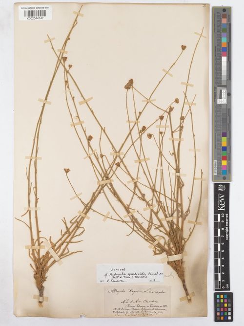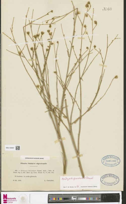 Andryala spartioides Pomel ex Batt. & Trab., it is a subwoody, much thickened and branched from the base perennial. Branches slendcr, stiff. with few, sparse, rush-like leaves and bearing 2-3 terminal, pedicellate capitula. Leaves very narrow, basal leaves sinuate-pinnatifid; the rest linear. subcntire to entire. Capitula small, involucral bracts with a mucro.