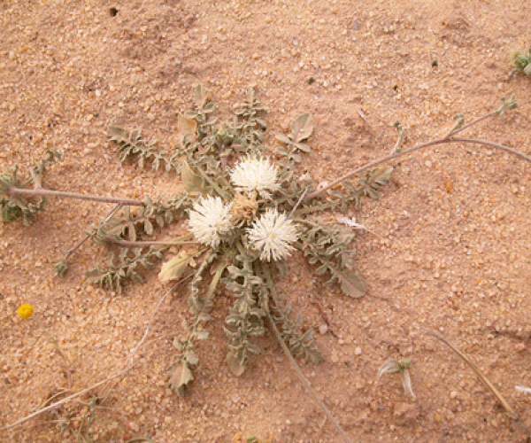 Anthemis cyrenaica Coss. / Syn. Anthemis cyrenaica var. cyrenaica, Anthemis cyrenaica var. radiata Pamp., it is an annual herb, small up to 7-12 (-20) cm, adpressed hairy villous, erect or ascending hairs woolly and biramus. Stems solitary to few, simple or branched above. Leaves 1-2 pinnatisect; lobes remote, linear acute-mucronate; base of the petiole with few lateral small lobes, but not dialated. Capitula 4-7 mm in diam, in discoid forms, up to 12 mm in radiale forms, homogamous or heterogamous, pedunculate. Peduncles 2-5 (-6) cm long (in radiate forms 2-4 cm), Striate, with 1-few rudimentary leafy appendages, slender but becoming thickened in fruiting below the capitulum. Receptacle strongly convex-sub globose. Involucre hemispherical; involucral bracts 4-5 rowed, imbricate, hirsute, hairy, broadly white scarious with mid-nerve ± herbaceous. Outer involucral bracts oblong-lanceolate, acute. Middle inyolueral bracts oblong, obtuse, margins fimbriate. Inner ones oblong-lanceolate. keeled above, margins hairy. Palea concavecarinate, ± oblong. outer peripheral ones ± truncate with mid-nerve prolonged into short cusp, with few scattered hairs near the apex; central ones somewhat tapered above, 2-3 toothed-erose near the apex. All florets tubular. hermaphrodite, yellow or marginal florets ligulate, female, white. Corolla of the peripheral tubular florets compressed, 2-winged. Cypsela cylindro-conical, pappose. sub 10-ribbed; ribs smooth; pappus articulate.