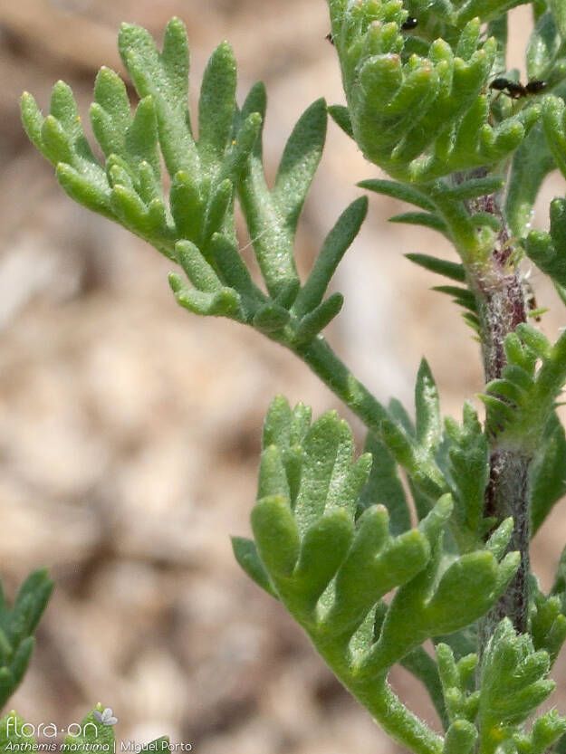 Anthemis maritima L., it is a perennial or subshrub, root furnished with long fibers. Stems 10-35 cm, prostrate or ascending, glabrous or pubescent at the apex. Leaves glabrous, somewhat thick, dotted with deep spots, pinnatipartite, with obtuse, lanceolate or cuneate lobes. Capitula with peduncles somewhat thickened at the apex. Receptacle with linear-oblong scales, abruptly cuspidate. Flowers tubular yellow, ligules white, elongated, oblong. Achenes very small (about 2 mm), whitish, smooth or very finely rugose, surmounted by an acute rim, toothed on one side.