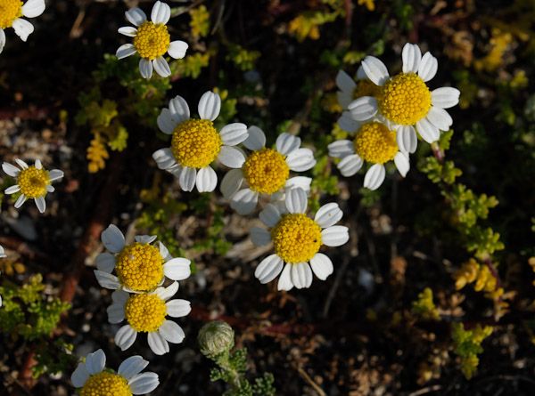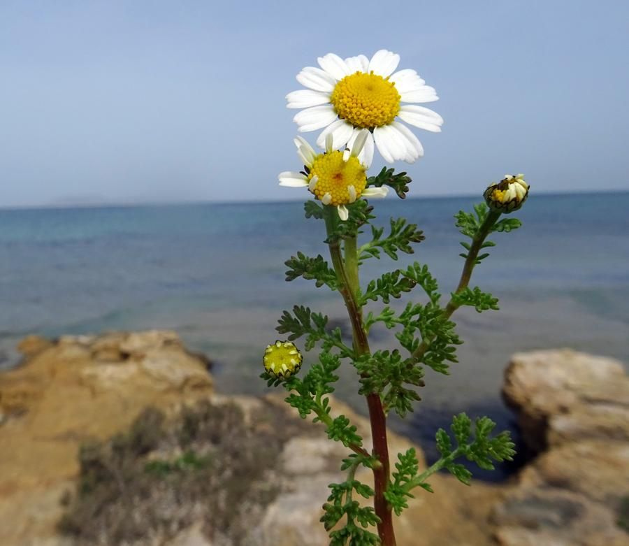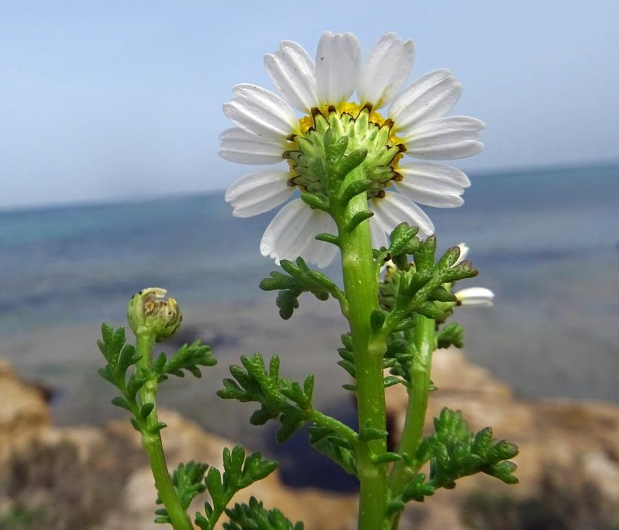 Anthemis secundiramea Biv., it is an annual herb, pubescent or glabrescent, erect or ascending. Stems numerous, up to 10-30 cm, much branched, often reddish in young parts. Leaves 1-2 pinnatisect or partite, ± fleshy, glandular-punctate beneath; lobes linear-lanceolate, acuto-acuminate; acumin callus, hyaline; base of the leaf entire, not lobed. Capitula radiate, 1-few per branch, pedunculate. Peduncles (1.5-) 2-5 (-6) cm, striated. often clubbing and becoming fistular at anthesis and in fruiting. Receptacle shortly conical or hemispherical-conical. Involucral bracts2-3 rowed, pubescent, with midnerve broadly herbaceous, rest broadly searious margined; margins hyaline or brownish; outer involucral bracts ovate-lanceolate, acute, more than half as long as the middle ones; inner ones oblong., obtuse. Palea scarious, lanceolate, obovate-oblong or obovate, convex-carinate, cuneate, equalling or shorter than the tubular florets, apex obtuse or mucronate. Marginal florets ligulate, White; basal tube compressed, ± winged; ligule ovate-oblong, truncate, 3-toothed. Central florets tubular, hermaphrodite; tube in the lower 2 ̸3 compressed and winged, becoming inflated and spongy in fruiting. Cypsela obaonical; marginal ones slightly incurved, 8-10 ribbed, ribs tuberculate; apex denticulate or with an oblique, short auricle; central cypselas with smooth, whitish ribs, ecoronate or shortly crenulate.