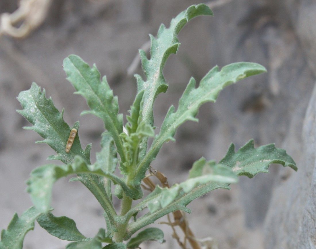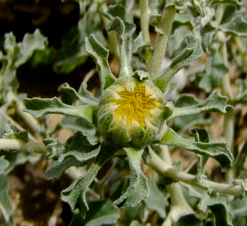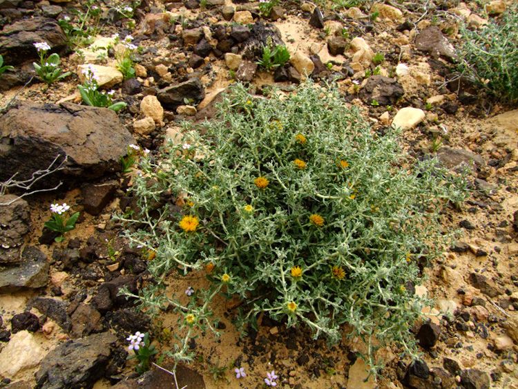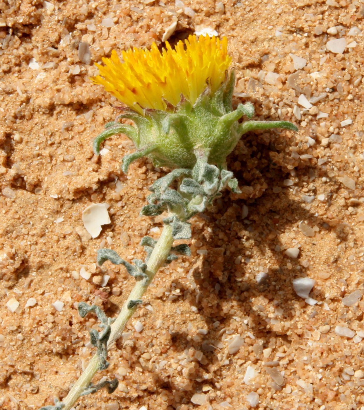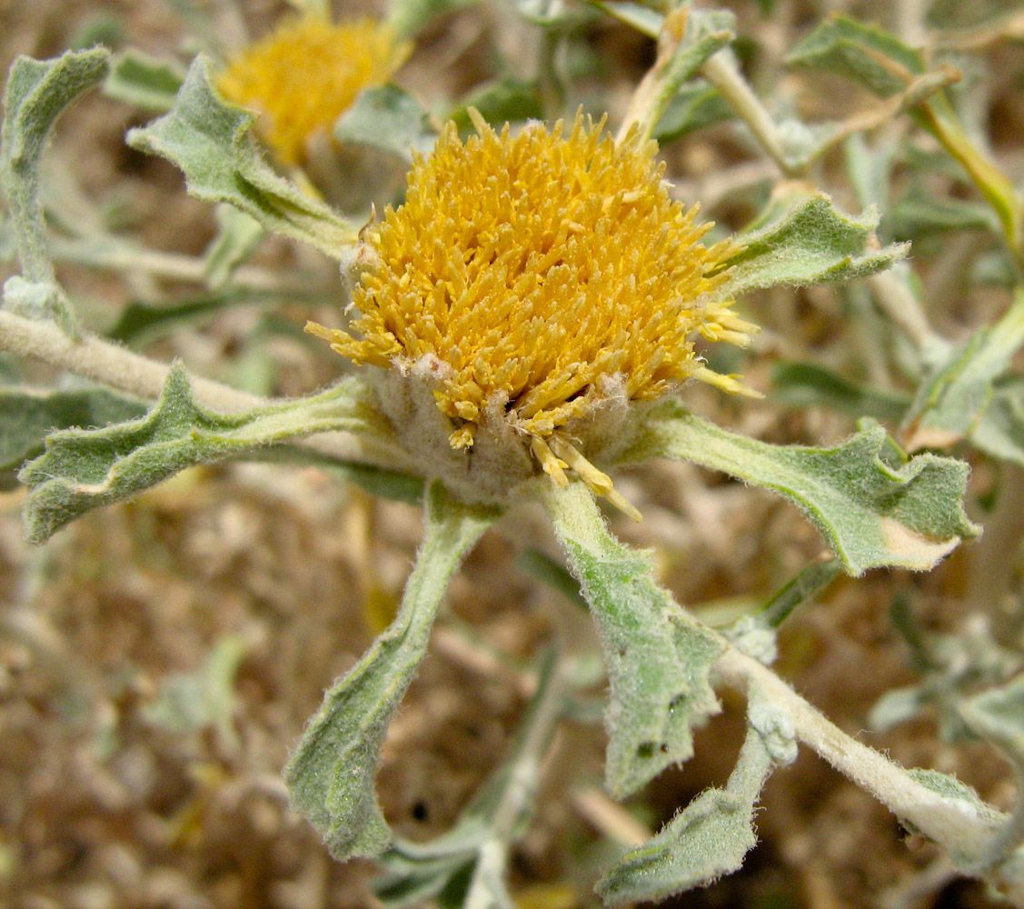 Anvillea garcinii (Burm.f.) DC., it is a subshrub woody, up to c. (30-) 50-60 cm tall. dichotomously branched, hoary or glabrescent. Leaves (9-) 12-20 (-25) x 2-4 (-6) mm, obovate or oblongo-cuneate, base attenuate into a narrow petiole, pinnati-toothed to pinnatifid, densely hairy; hairs adpressed. Capitula 25-30 mm (including ray floret) or 10-13 (·15) mm (when ray florets absent) in diameter, yellow or golden yellow. Receptacle cup-like; involucre 15-20 mm long; basal parts of involucral bracts fused and closely invested round the receptacle; free parts of the 3 outer rows of the involucraI bracts (10) 13-15 (.20) mm, erecto-patent, herbaceo-foliaceous, obovate-spathulate, pinnatilobed; free parts of the inner rows of involucral bracts (6-) 8-10 mm, ovate-oblong, acute. Palea 5.5-6 mm (exclude, terminal appendage) coriaceous, boat-like basal part closely investing the floret, midnerve strongly keeled at the back, apex drawn into a long (4.5-5 mm), narrowly lanceolate, setaceous appendage. Ray florets (when present) neutral, 13-15 x 3.25 mm, narrowly lanceolate, 2-loothed; ovary 1.75 mm, 3-gonous, adaxial face flattened, margins near the apex with few glandular hairs style and stigma absent. Disc florets hermaphrodite; corolla 6.5-7 5 mm, tubular; tube gradually widening upwards, 5-lobed; lobes 0.25-0.5 mm, ovate, acute; ovary 1.5-2.0 mm, 5-angled, many ribbed, angles hairy, hairs glandular; pappus absent.
