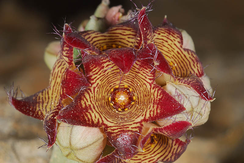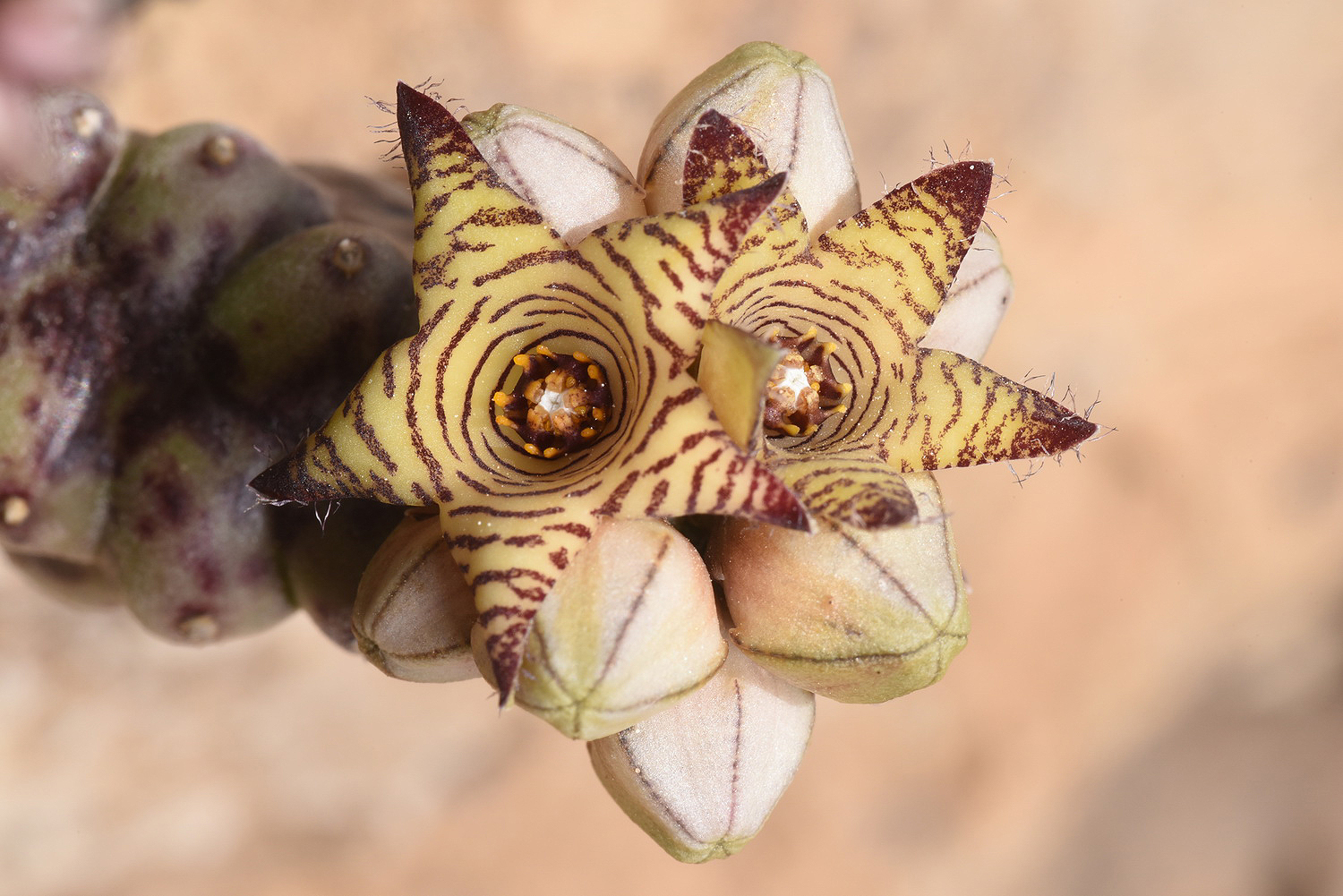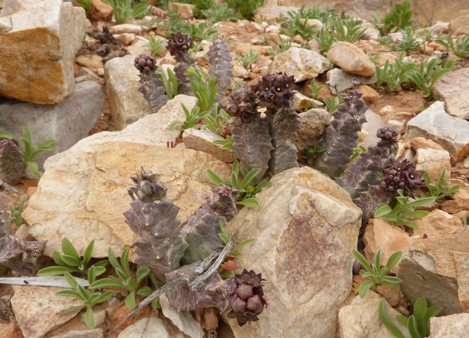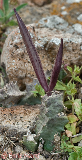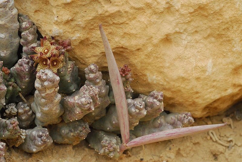 Apteranthes europaea (Guss.) Murb. / Homotypic Synonyms: Caralluma europaea (Guss.) N.E.Br. It is a succulent subshrub, stolons long. Aerial stems up to 15 cm, ascending to procumbent, with ± flat faces. Nodes less than 1 cm apart. Leaf sessile, broadly ovate to orbicular, c. 1.5-2.5 x c. 1-2.5 mm, entire, acute. Inflorescence with 10 or more flowers. Pedicel c. 3 mm long. Calyx lobes c. 2 mm long. Corolla 12-17 mm in diameter, rotate, lobes broadly ovate, dirty white with purple bands, or partly or completely purple, ciliate in the central portion and along the margin. Corona c. 4 mm in diameter. Stigma c. 1.5 mm wide, 5 angled. Follicle 10-13 cm x c. 5-6 mm, gradually tapering to a point, glabrous.