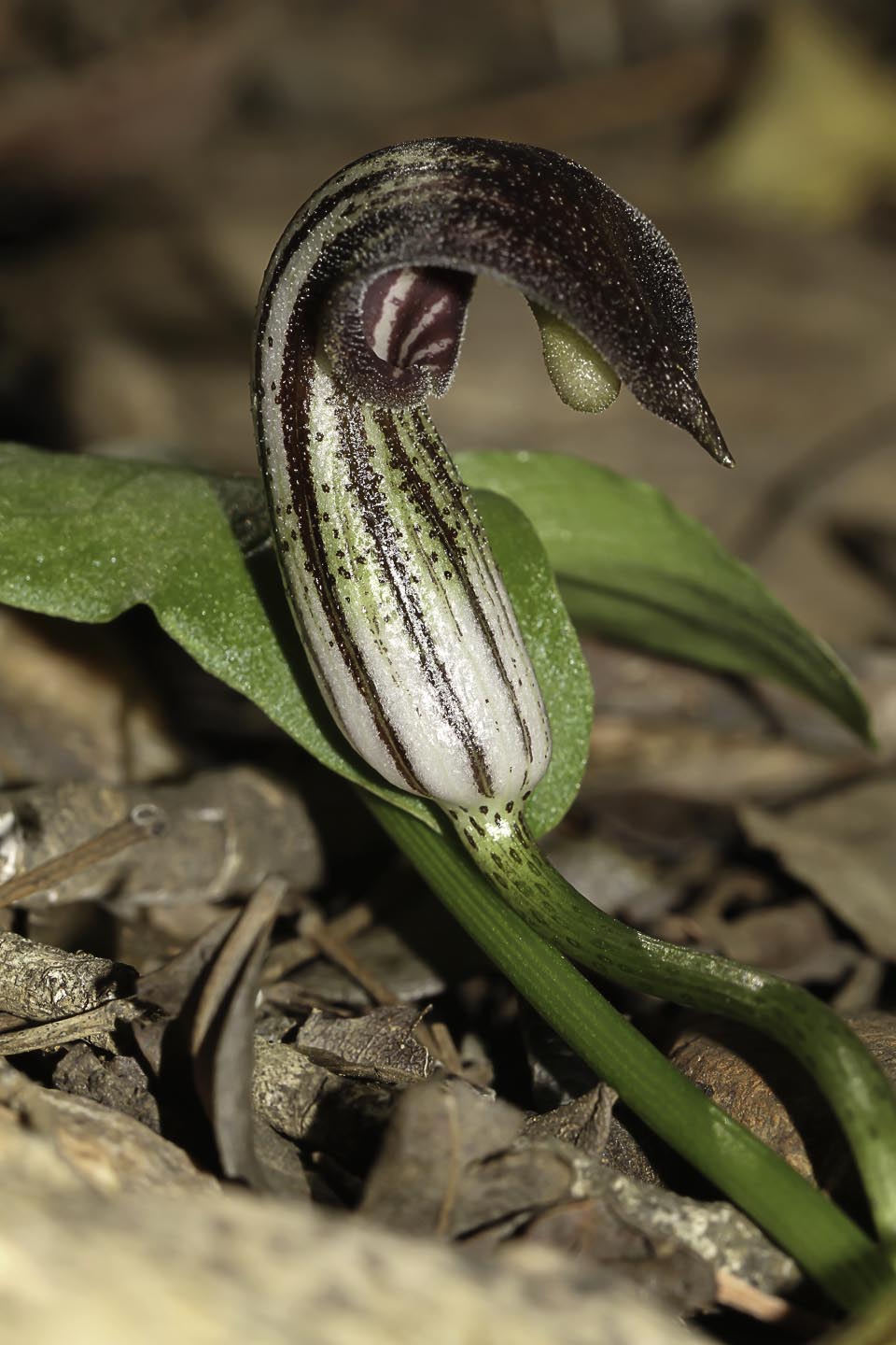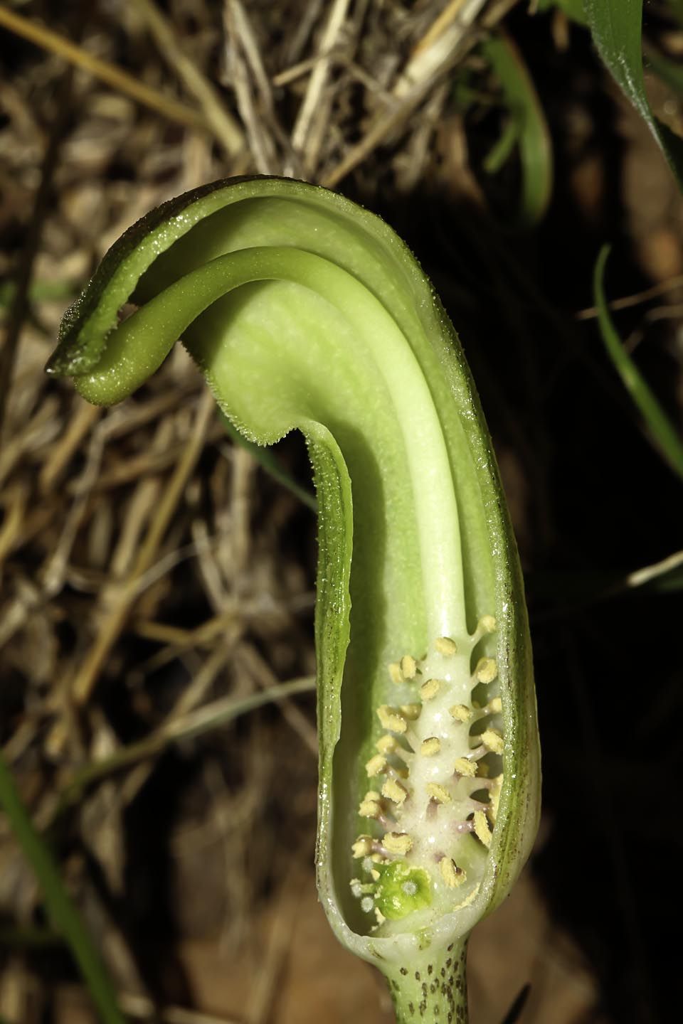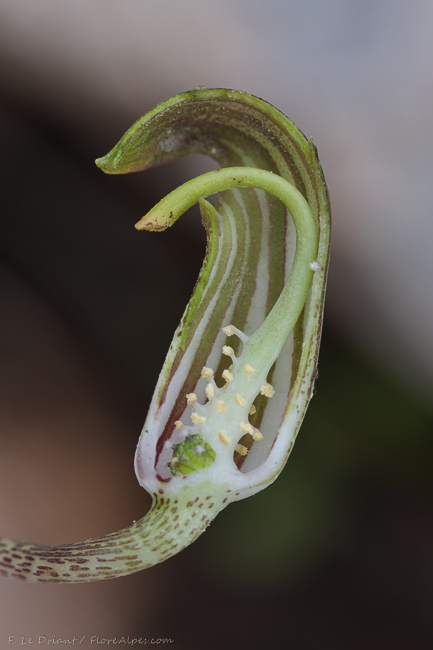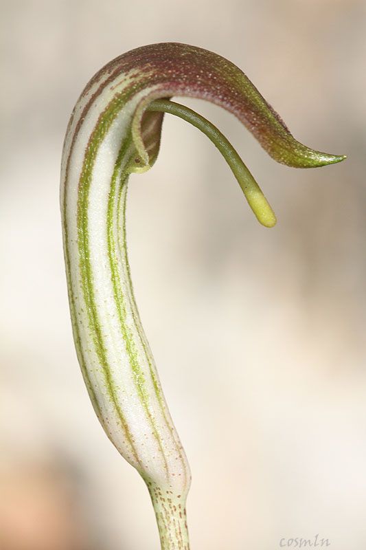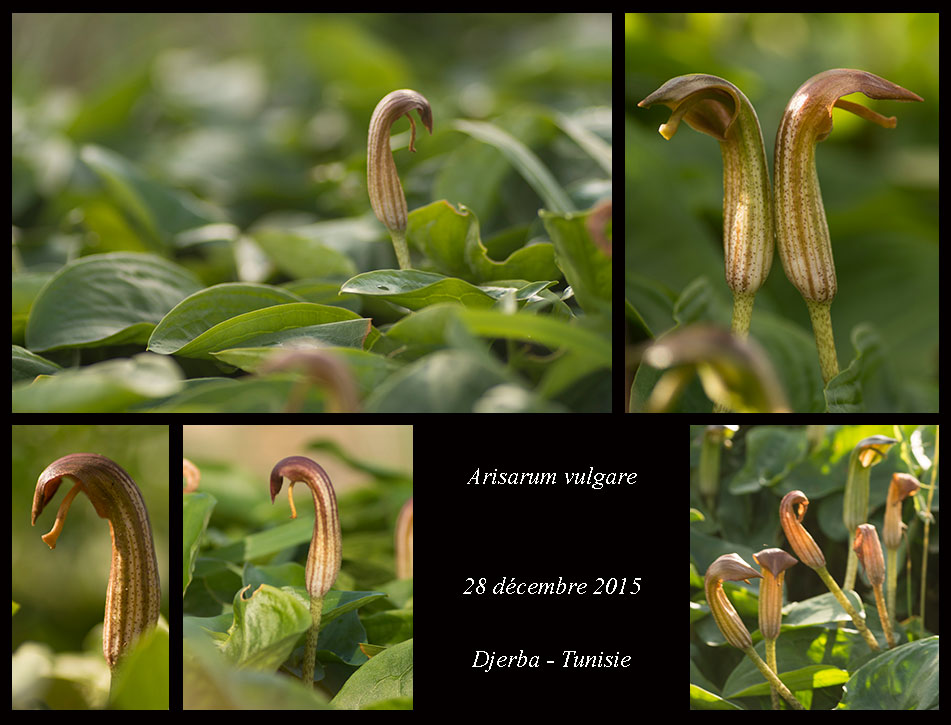 Arisarum vulgare O.Targ.Tozz. , it is a tuberous geophyte, perennial green cormous herb; corms dark brown, c. 1-2 cm in diam., rooting from the top part, usually deep in the ground. Leaves sagittate to cordate c. 7-20 x 5-18 cm, entire with reticulate venation, upper surface shining; petiole 15-40 cm long, brown-purplish mottled, sheathing most of the underground portion of the scape. Scape 15-20 cm long mostly underground, the lower part also mottled and the above soil surface brown-greenish. Spathe tubular, 4-9 cm long with aecuminate tip, the outer surface brown-greenish with white stripes. Spadix usually exserted with inflated tip; female flower at the lower part of the spadix while, male above; ovary ± spherical. Style short and stigma capitate. Fruit berries in groups of 3-4, green sub globose, c. 1 cm in diameter.