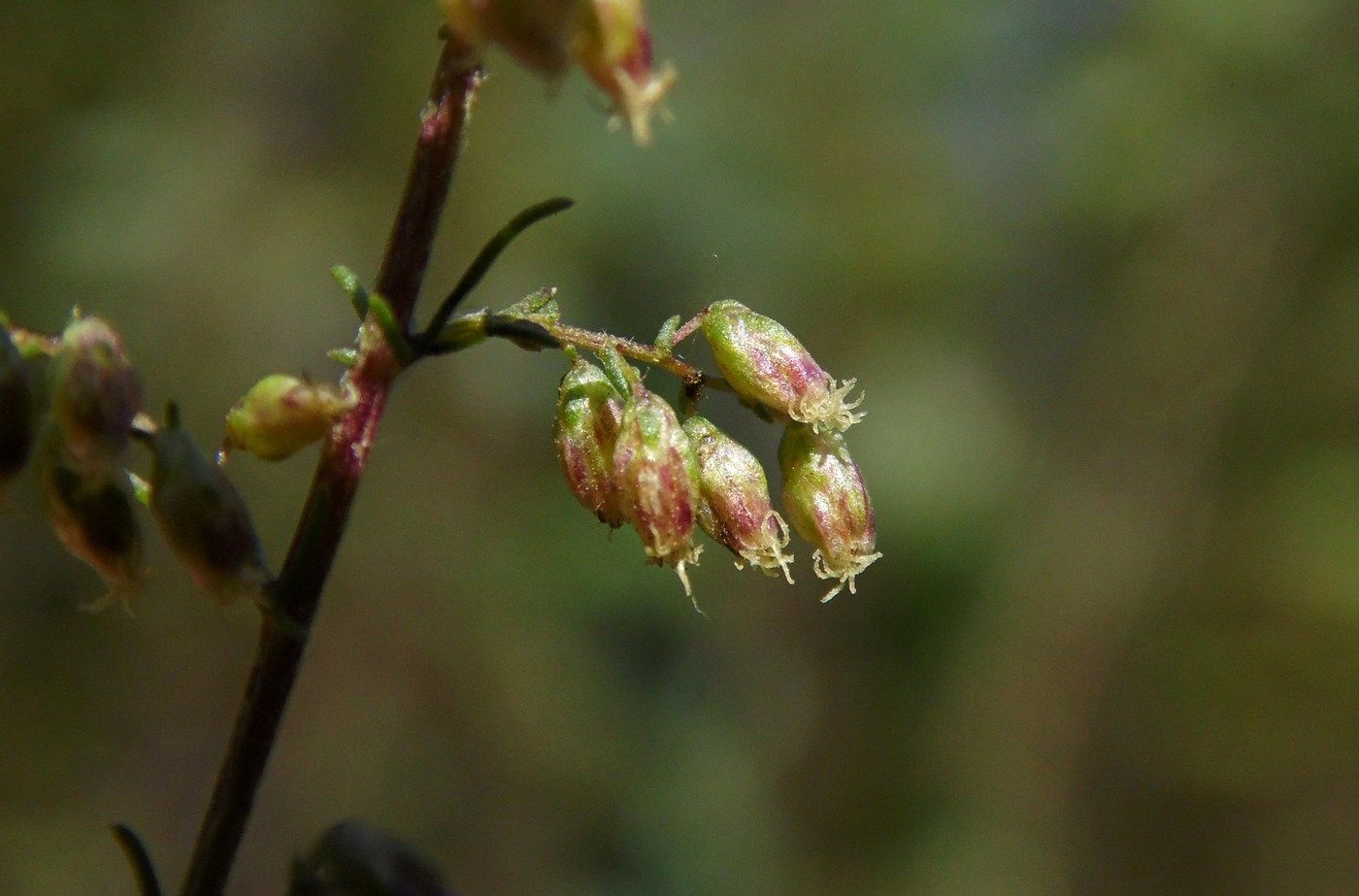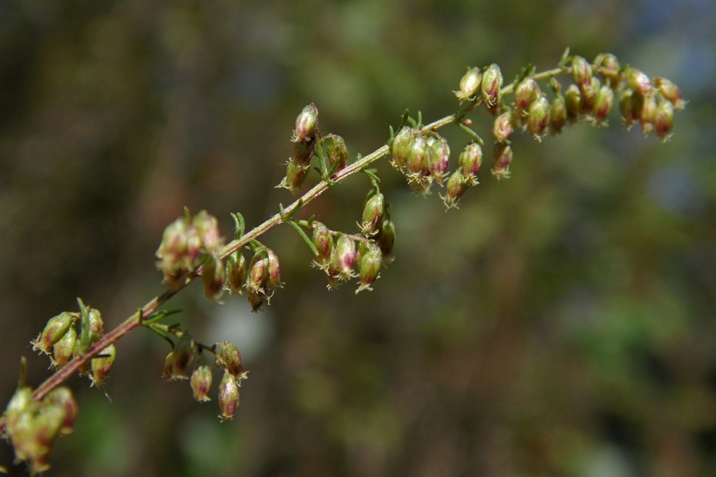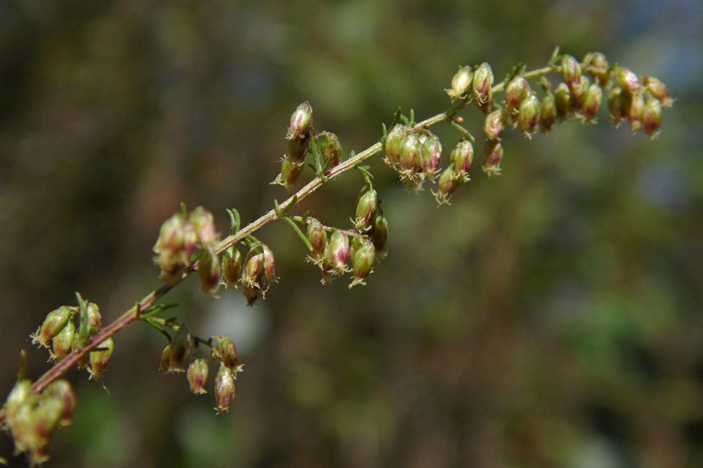 Artemisia scoparia Waldst. & Kit., it is a  perennial, basally woody herb with solitary or several, branched in upper part, 40-80 (-90) cm tall, ± patulous hairy to mostly glabrous, purplish-brown tinged stems from upright branched rootstock. Basal and lower stem leaves with 1.5 cm long petiole, densely patulous hairy to almost glabrous, lamina ovate-orbicular, 4-7 x 2.5-5 cm, 2 (-3)-pinnatisect into linear or linear-lanceolate, 3-4 x 0.5-1 mm, acute segments; middle and upper stem leaves sub sessile to sessile, auriculate, hairy or usually glabrous; uppermost in the floral region acicular with auricles. Capitula heterogamous, numerous, shortly pedunculate, oblong-globose, c. 2 x 1.5 mm, nodding in narrow to broadly pyramidate, 20-50 x 10-35 cm panicle with horizontally or ± obliquely patent or occasionally ± erect, 8-30 cm long primary and 2-8 cm long secondary branches. Receptacle conical, glabrous. Involucre 3-4-seriate, phyllaries glabrous, imbricate, outermost ovate-orbicular, c. 0.8 mm long, narrowly scarious margined, inner ones oblong-ovate, c. 1.25 x 0.8 mm, broadly hyaline scarious. Florets 10-12, yellow; marginal florets 5-6, fertile, with c. 0.7 mm long, tubular, 2-dentate corolla; disc-florets 5-6, functionally staminate, with c. 1.25 mm long, tubular, 5-toothed, glandular corolla. Cypselas oblong-oval, c. 0.8 mm long, brown..