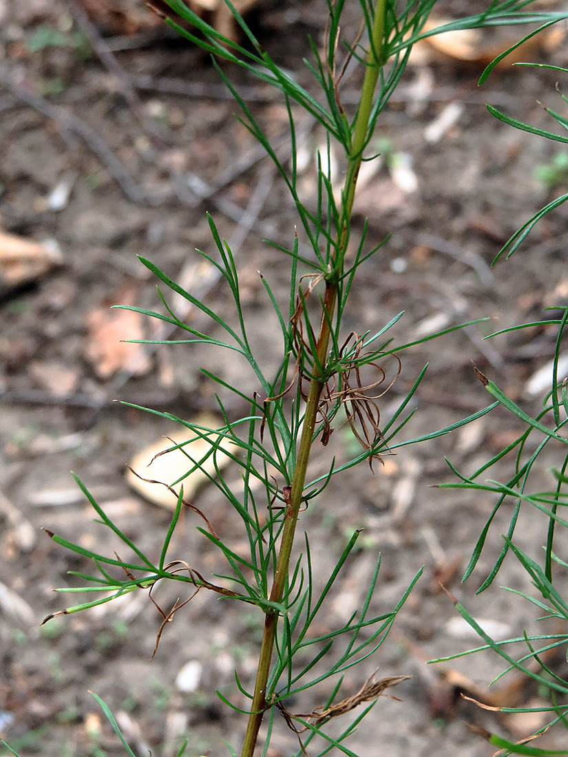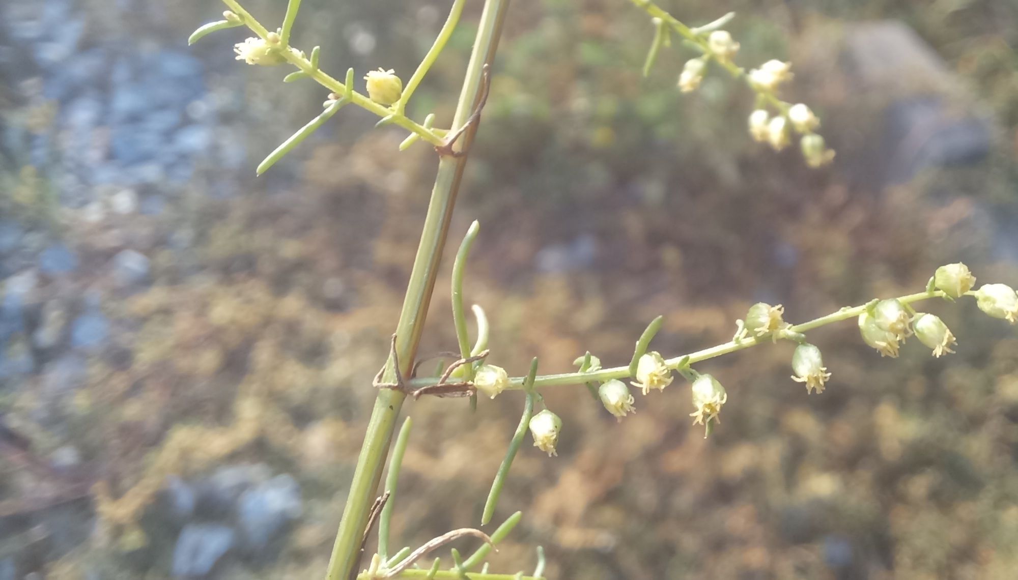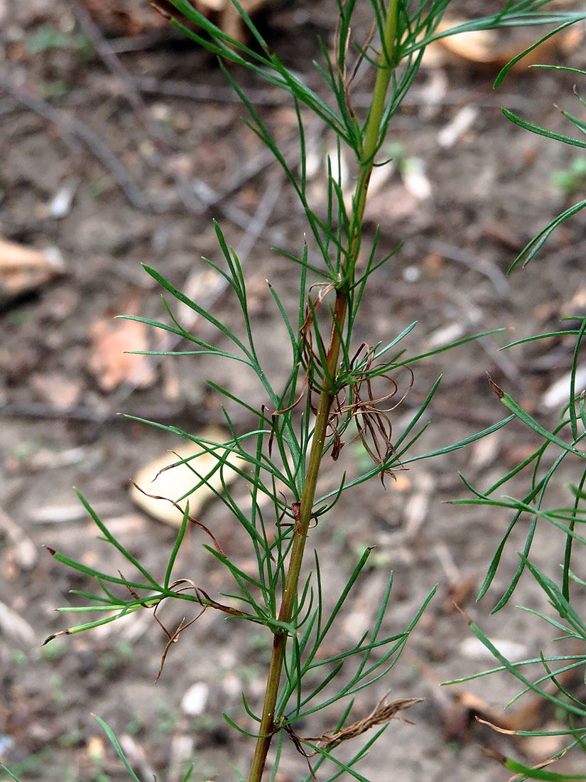 Artemisia scoparia Waldst. & Kit., it is a  perennial, basally woody herb with solitary or several, branched in upper part, 40-80 (-90) cm tall, ± patulous hairy to mostly glabrous, purplish-brown tinged stems from upright branched rootstock. Basal and lower stem leaves with 1.5 cm long petiole, densely patulous hairy to almost glabrous, lamina ovate-orbicular, 4-7 x 2.5-5 cm, 2 (-3)-pinnatisect into linear or linear-lanceolate, 3-4 x 0.5-1 mm, acute segments; middle and upper stem leaves sub sessile to sessile, auriculate, hairy or usually glabrous; uppermost in the floral region acicular with auricles. Capitula heterogamous, numerous, shortly pedunculate, oblong-globose, c. 2 x 1.5 mm, nodding in narrow to broadly pyramidate, 20-50 x 10-35 cm panicle with horizontally or ± obliquely patent or occasionally ± erect, 8-30 cm long primary and 2-8 cm long secondary branches. Receptacle conical, glabrous. Involucre 3-4-seriate, phyllaries glabrous, imbricate, outermost ovate-orbicular, c. 0.8 mm long, narrowly scarious margined, inner ones oblong-ovate, c. 1.25 x 0.8 mm, broadly hyaline scarious. Florets 10-12, yellow; marginal florets 5-6, fertile, with c. 0.7 mm long, tubular, 2-dentate corolla; disc-florets 5-6, functionally staminate, with c. 1.25 mm long, tubular, 5-toothed, glandular corolla. Cypselas oblong-oval, c. 0.8 mm long, brown..