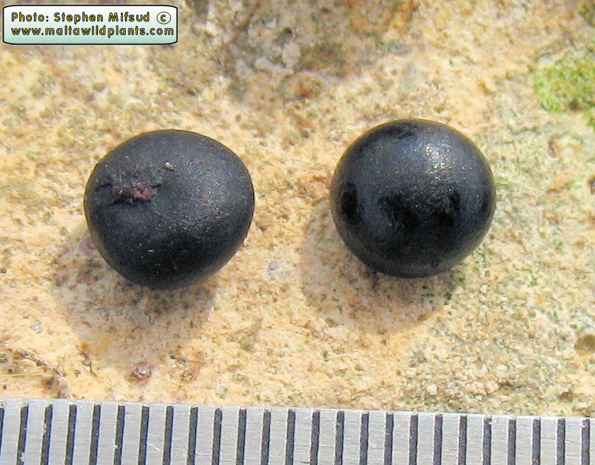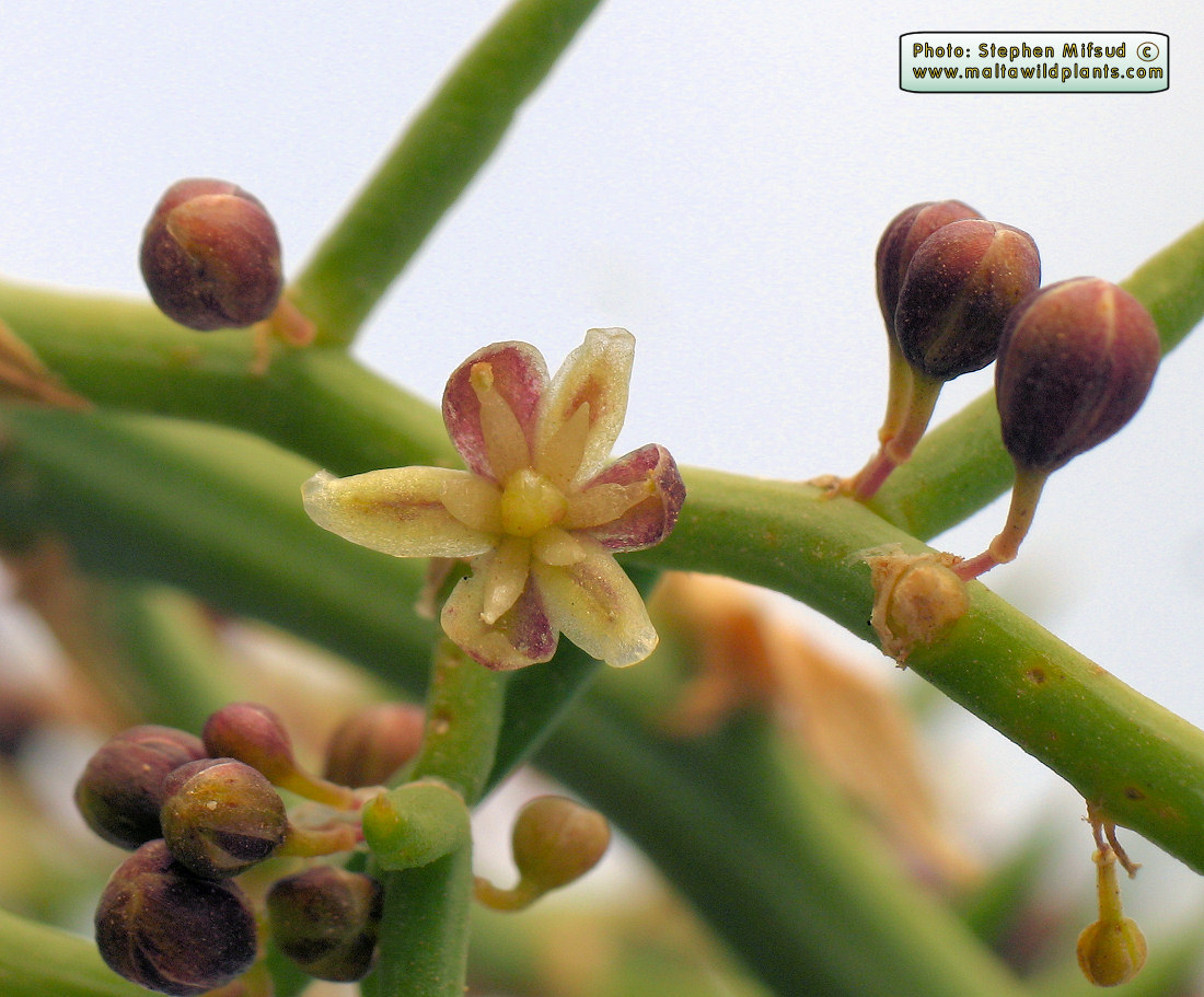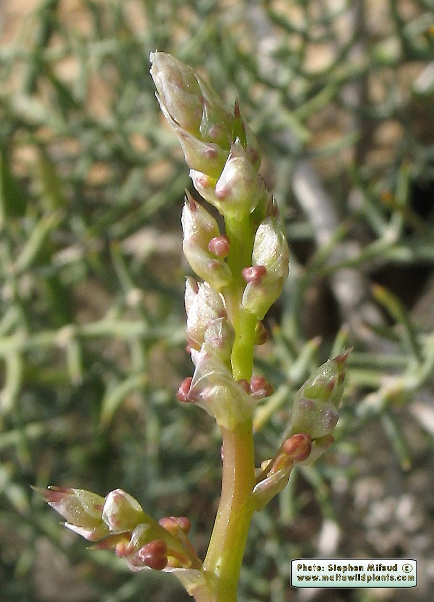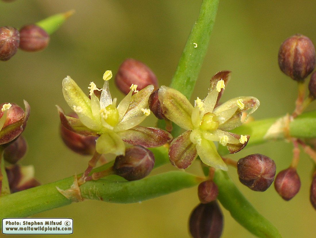 Asparagus horridus L. / Heterotypic Synonyms: Asparagus stipularis Forssk., it is a shrub plant bushy with short underground rhizome, roots fleshy, tuberous at early stages of development; tubers with sacs full of raphide crystals; stems erect or nodding, intricately branched, c. 100 cm long; cladophylls solitary, terminal ones usually in groups of 2-3, more or less alternate, with angled groovy surface and spiny tips. Leaves reduced to triangular, lanceolate rudiments or scales, white-creamish in colour, c. 5 mm tong, at the base of each branch; lower leaves usually prickly. Flowers white-greenish inside, green brownish outside. either solitary or in fascicles of 2-3 on each side of the caldophyll base; pedicels short, 2-3 mm, as long as the reduced peduncle, both joined together in an articulated point. Perianth stellate. with ± free, oblong-lanceolate, obtuse, unincrwd tepals, 2-3 mm long. Stamens sub equal; filaments entire becoming deltoid toward the base; anthers oblong, medifixed. with yellow pollen. Ovary ± spherical, with one short style and trilobed stigma. Fruit a globular berry, black to black-reddish in colour when mature, 3-7 mm in diameter.
