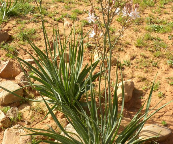 Asphodelus aestivus Brot., it is a tuberous geophyte, are branched, up to 1.5 m, it has a rhizome surrounded by fibers, with fusiform tuberous roots, tubers slightly c. 13 x 3 cm. The bases of the rosette leaves covered with dense, splitting fribrous sheath, c. 10 cm long; filament bases broader from top with papilate margins, sometimes papillae present on the lower portions of the filaments also.
