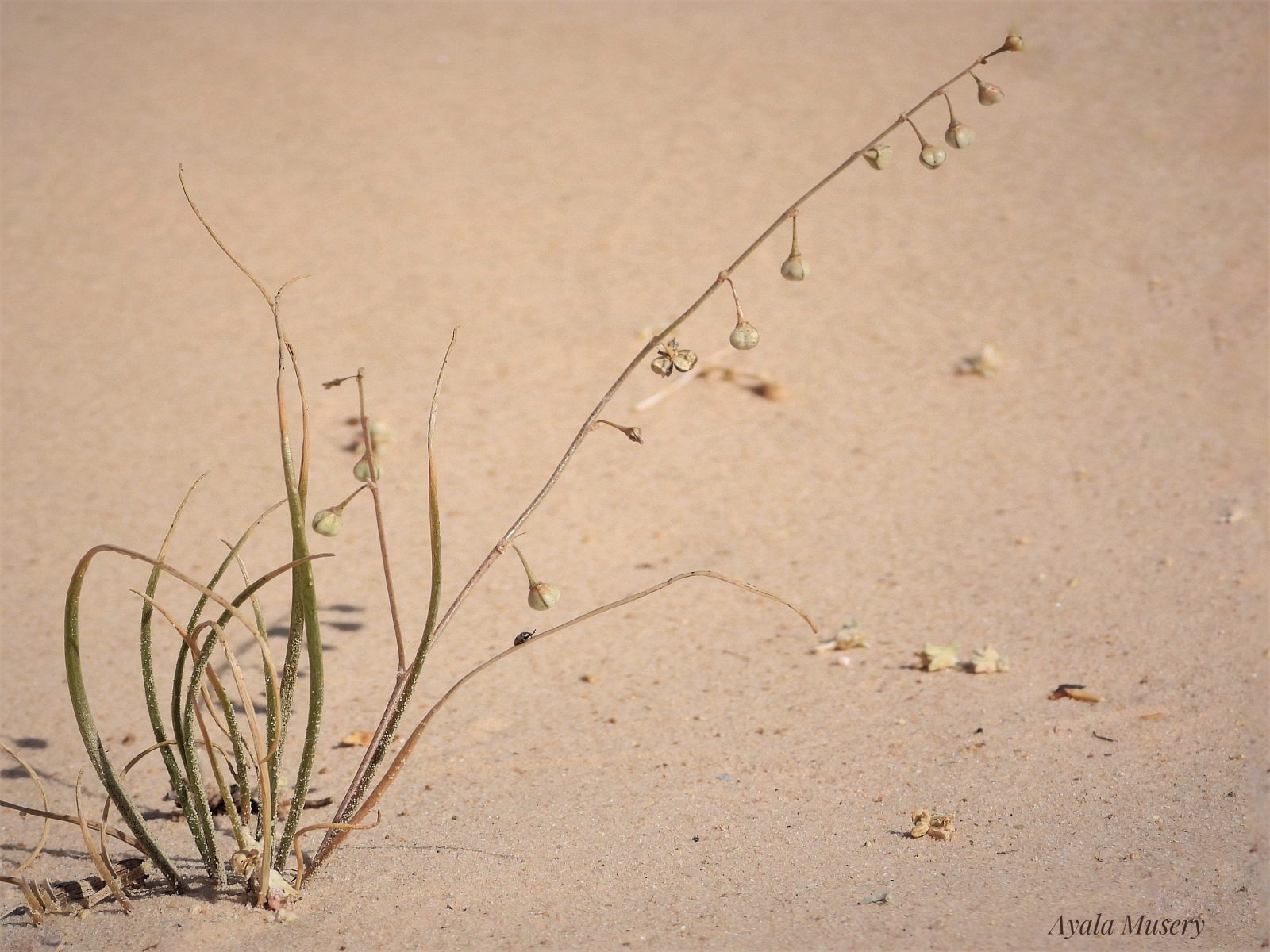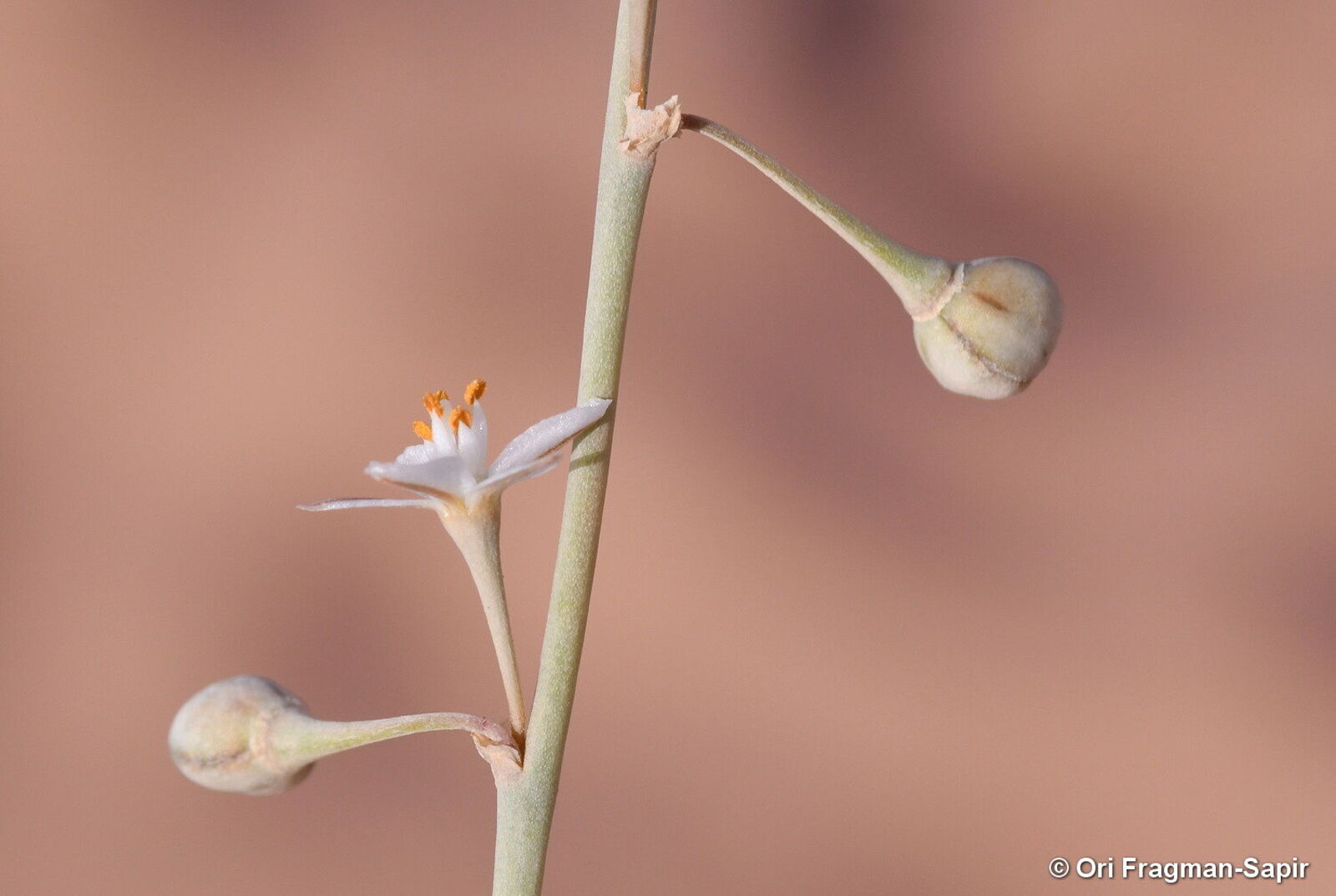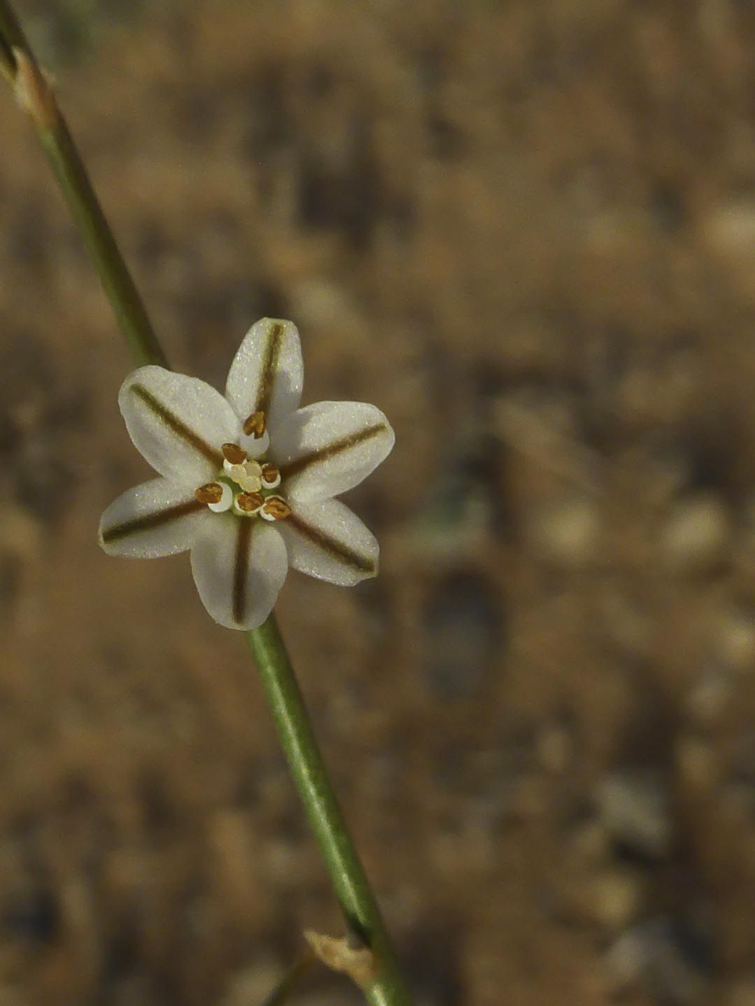 Asphodelus refractus Boiss., it is an annual herb, with one main root, and many branches. Leaves all basal forming a rosette, green, glabrous, sticky, ± semicircular, hollow, c. 20 x 0.2 cm, attenuate. Scape 1-6 per plant. glabrous, hollow, leafless rarely leafy, c. 1 (-1.5) m high, with many branches, (branches usually shorter, up to leaves level). Inflorescence double to triple racemed-panicle, with many flowers. Bracts 2-3 mm long memhranous, ± triangular with acuminating tip, whitish with dark nerve. Flowers small, solitary or in pairs., bracteolate. Pedicels c. 6 mm. articulate at the lower third, ± near base. Perianth stellate. Tepals 6, ± equal, linear-lanceolate, obtuse, 2-3 x 1-1.5 mm, whitish with dark purple nerve. Stamens 6, sub equal, shorter than tepals; filaments ± fusiform, with alternating tip and flattened base. Anthers ovoid-oblong, c. 1 mm long, middixed. yellow-orange in colour. Ovary green, sub globular, tricarpellate. Style filiform, equaling to shorter than stamens, stigma trilobed, each lobe inflated at tip. Capsule hemispherical-hexagonal, 3-4 mm in diam. Seeds ± triquetrae c. 2 x 1 mm with blackish testa.
