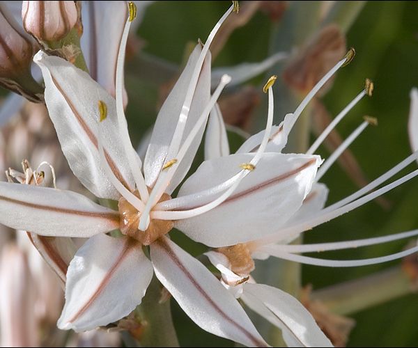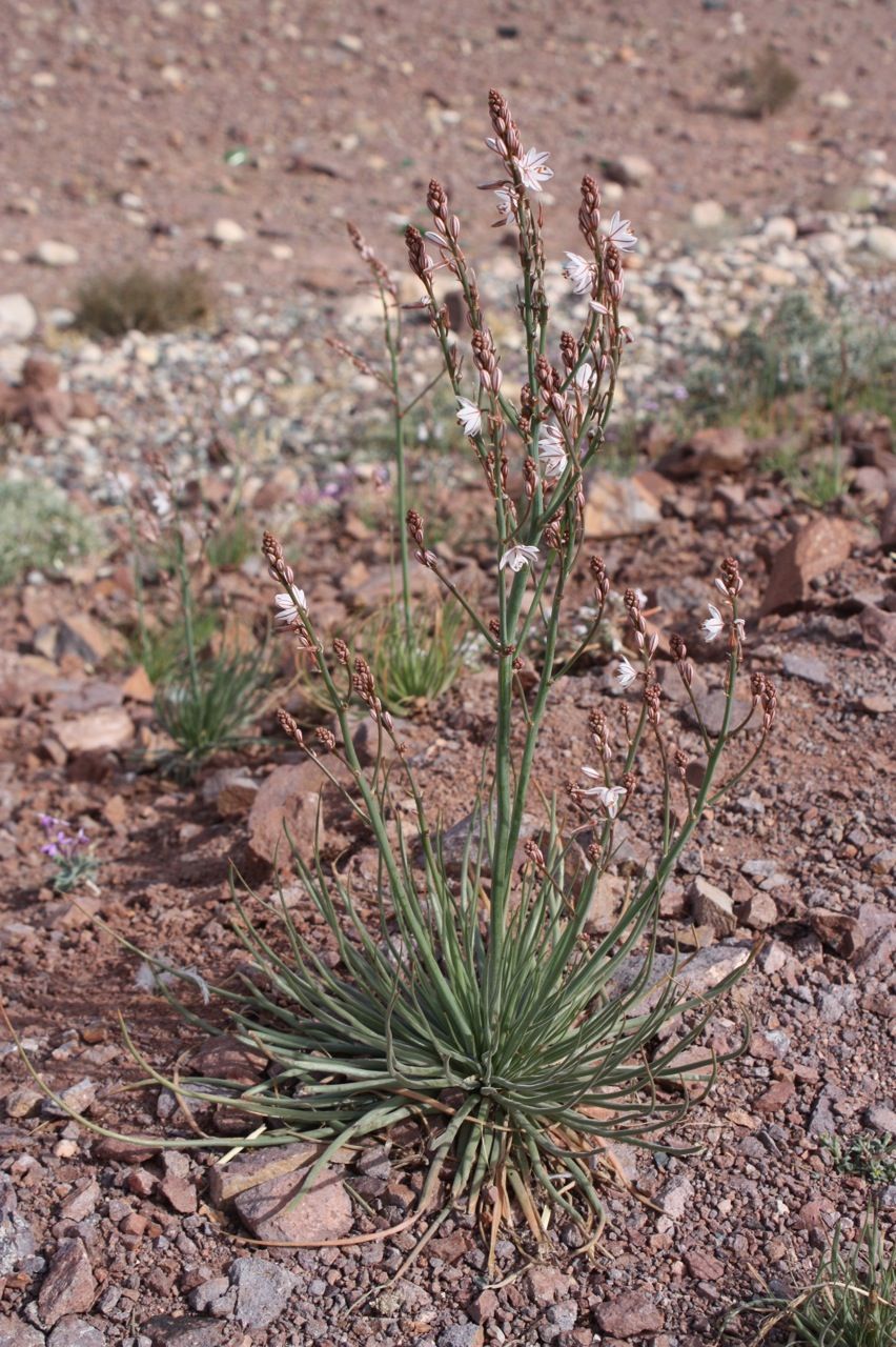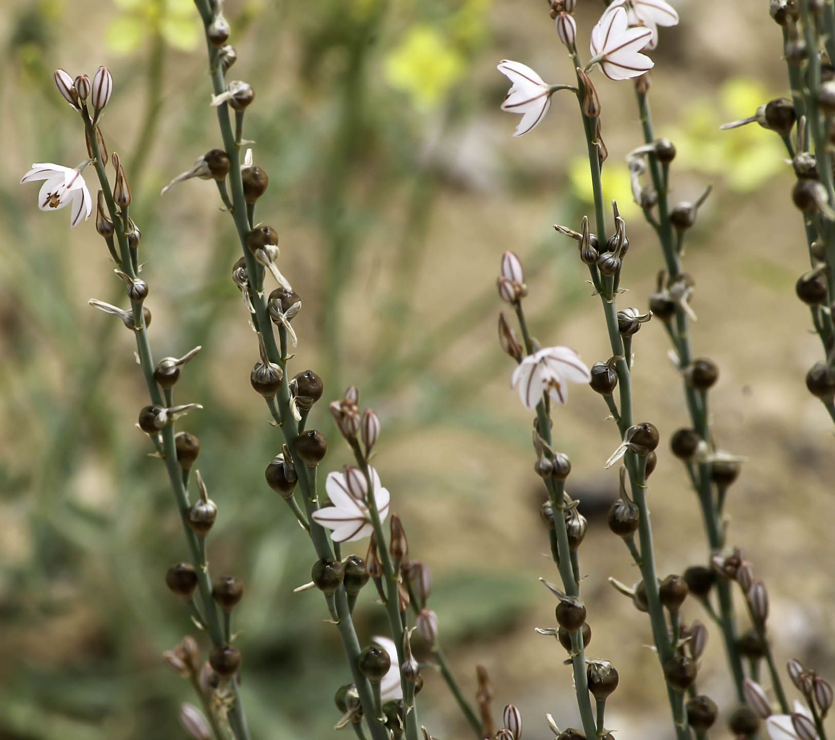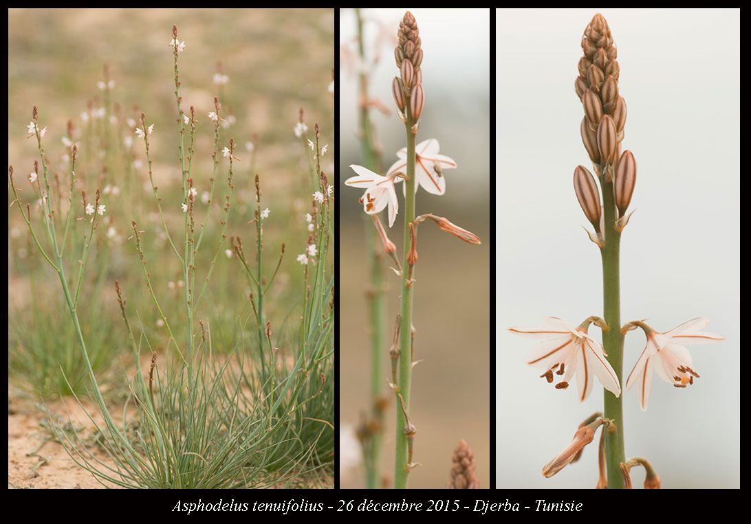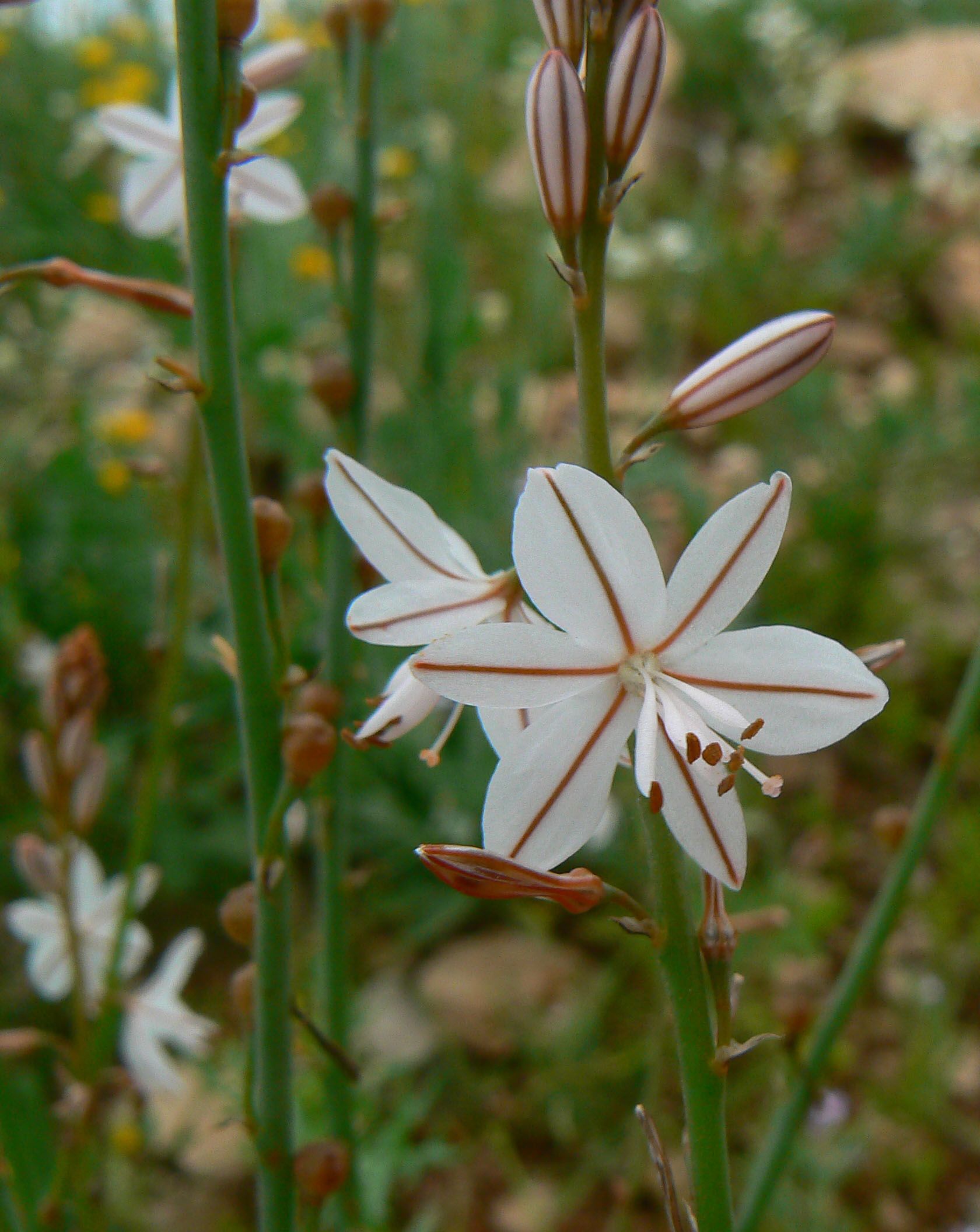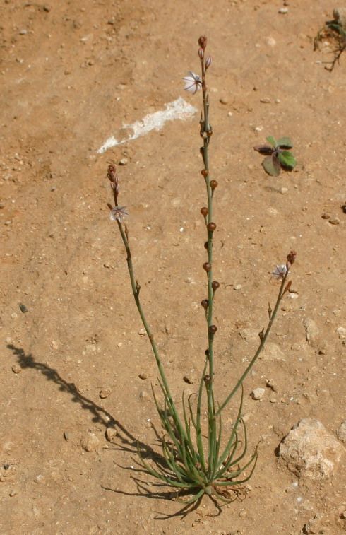Asphodelus tenuifolius Cav., it is an annual, herb, dark green herbaceous, with discoid rhizomatous stem and yellow fibrous roots. Leaves many, basal erect, c. 30 x0.5 cm. dark green in colour, tubular with tapering tip, surface papillose, papille in parallel rows along the veins. Scape 1-7 per plant c 50 x1 cm when mature, usually at different stages of growth, circular, hollow, glabrous, leafless (sometimes with leaves. c. 20 cm long), carrying a racemed panicle with many flowers, racemes bracteolate; bract triangular linear., membranous c. 1 cm long; pediccls, bracteolate, green, articulate at middle, c. 1 cm long, slightly inflated at top. Bracts membranous, (leafy, green when young) c. 0.5 cm long. Flowers small. Perianth campanulate to stellate. Tepals 6, free, lanceolate to linear-oblong, obtuse, white-pinkish with brownish nerve, the outer c.0.7 x 0.2 cm and inner c. 0.7 x 0.3 cm. Stamens 6, ± equal, shorter than tepals, filaments fusiform with flat concave bases covering the ovary. the entire filament papillate, papillae more distinct at base. Anthers orange, midefixed. Ovary green-brownish, hemispherical. Style slightly longer than stamens, c. 0.3 cm. stigma trilobed. each lobe terminated with a papillalte sphere. Capsule globose. Seeds brown to blackish. fusiform-triquetrate 0.3-0.4 cm long.