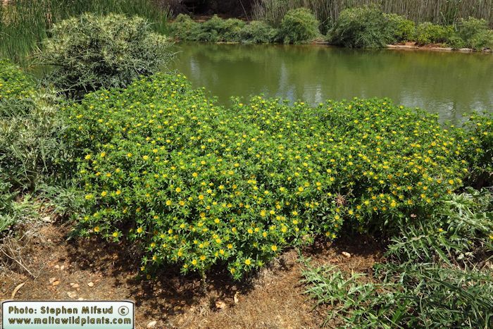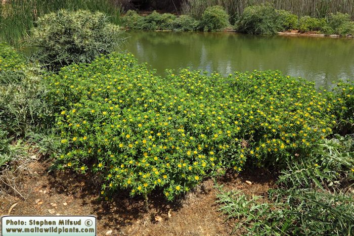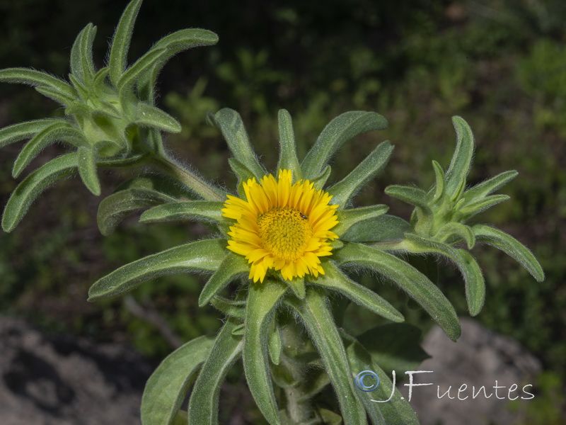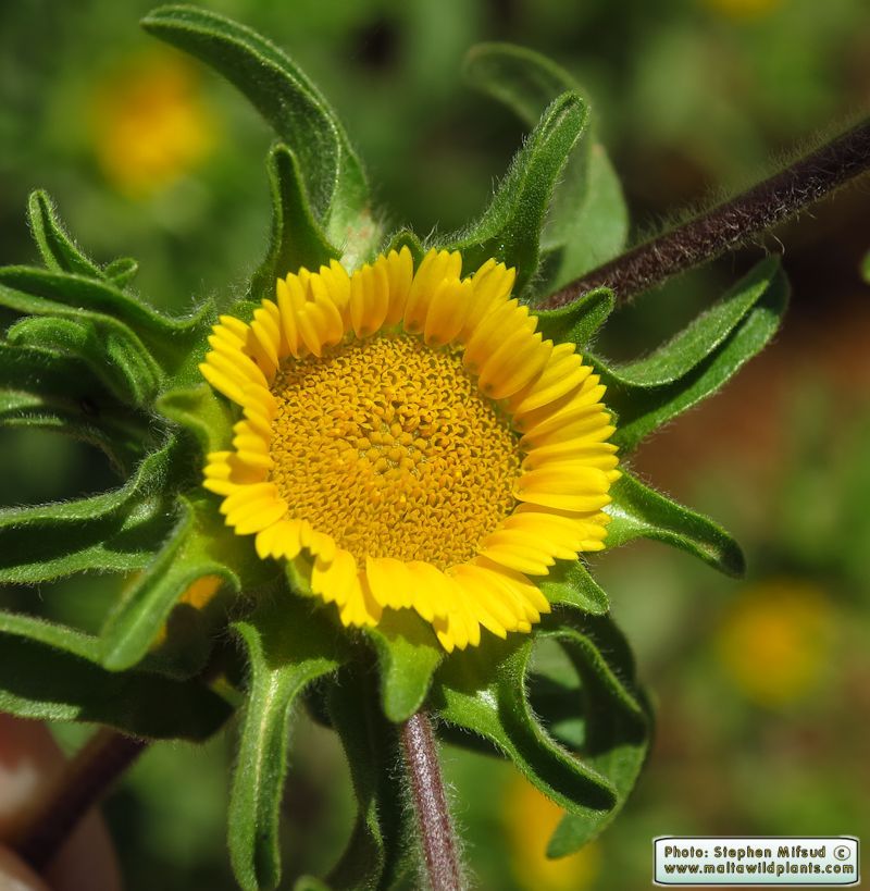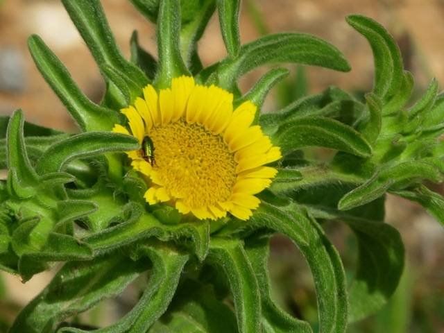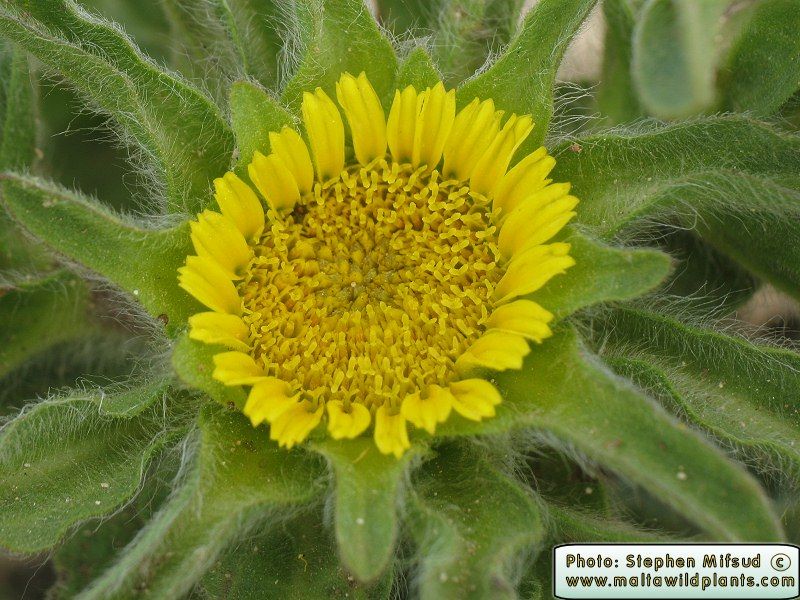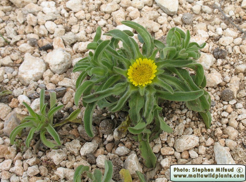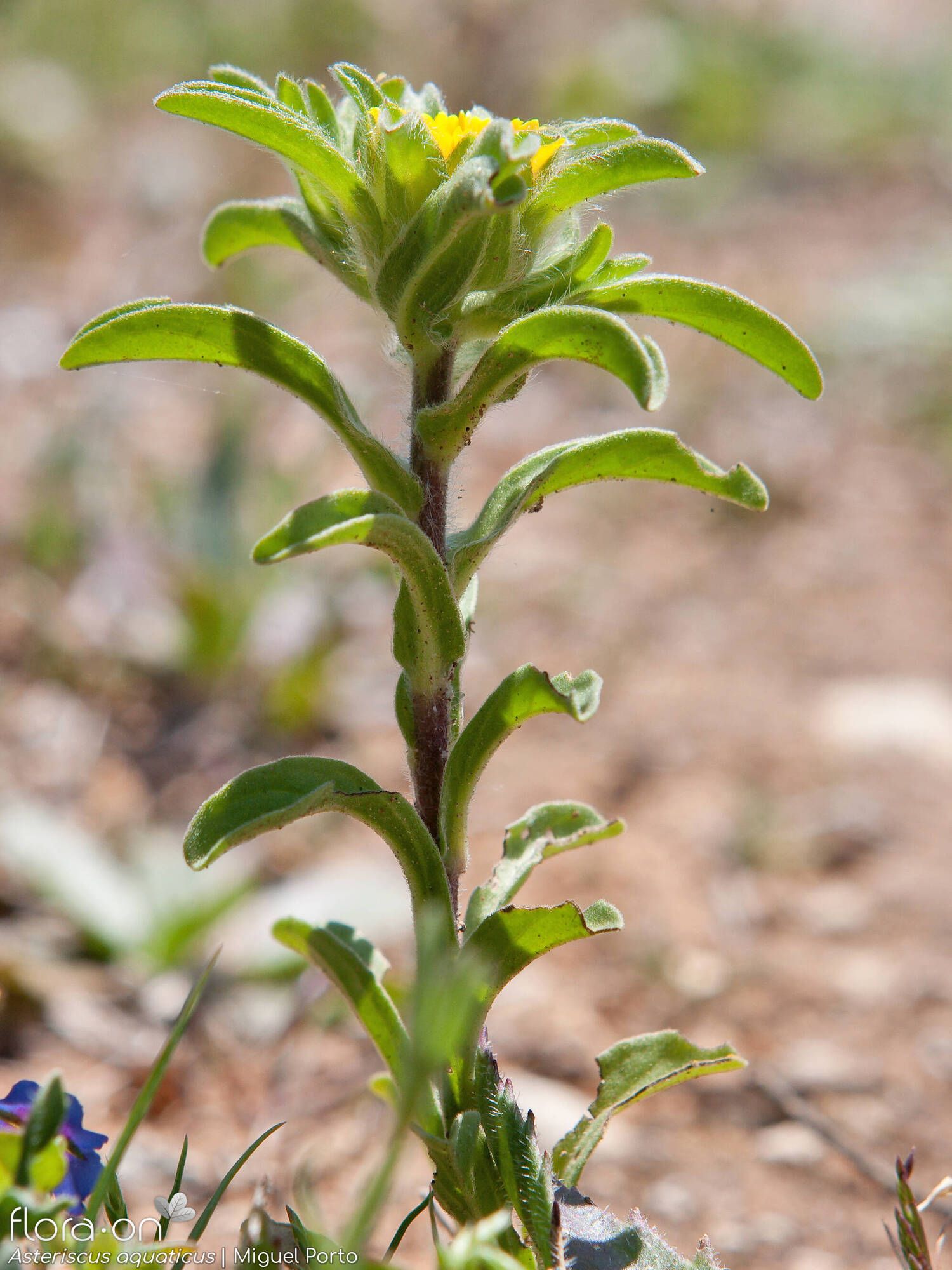 Asteriscus aquaticus (L.) Less., it is an annual herb, up to 10-15 cm tall, suffruticose, simple or dichotomously branched, hairy; branches erecto-patent, usually near the apex. Leaves 5-8 x 0.15-1.5 cm, oblanceolate-spathulate to oblong, entire, obtuse, with simple, adpressed hairs. Lower leaves tapering down in a narrow petiole. Upper leave sessile with ± semiamplexicaul bases. Capitula 12-14 mm in dim, (including ray florets), yellow, sessile in the angle between the bifurcation of the branches or terminal on short peduncles. Involucral bracts of 1st, row 16-18 (-20) x 5 mm, broadly lanceolate, acute, hairy on both surfaces, basal portion coriaceous, rest ± fleshy-foliaceous, margins hairy. Involucral bracts of 2nd, row 13-15 x 5 mm, oblong, obtuse, hairy on surfaces. basal part coriaeeous, rest foliaceous, margins hairy. Involucral bracts of 3rd row 9-10 x 4 mm, oblong, obtuse, coriaceous, outer surface sparsely hairy, the inner surface very sparsely hairy in the upper part only, margins in the lower part papillate, upper part sparsely hairy. Palea 3-4.5 x 2-3.5 mm, oblong-obovate, obtuse, slightly concave, the peripheral ± coriaceous, the central one membranous, margins near the apex papillate or sparsely hairy. Ray Florets 17-18, 1-rowed, yellow. Corolla 5.5 x 2-2.5 mm (includ. basal tube 1.75 mm and lobes 0.25 mm), ligule narrowly wedged shaped, 3-lobed, the ribs on the back hairy; basal tube weakly 3-angular, hairy. Ovary 2-2.25 mm, 3-angled, hairy, pappose; hairs silky white; pappus of 6-7 scales; scales 0.75-1mm long, sharply aristate. Disc florets yellow. Corolla 2.5-2.75 mm, tubular campanulate, glabrous, 5-Iobed; lobes 0.75 mm, acute. Ovary 1.5 mm, obconical 4-angled, hairy, pappose; pappus of 6-7 scales; scales c. 0.75 mm, sharply aristate.