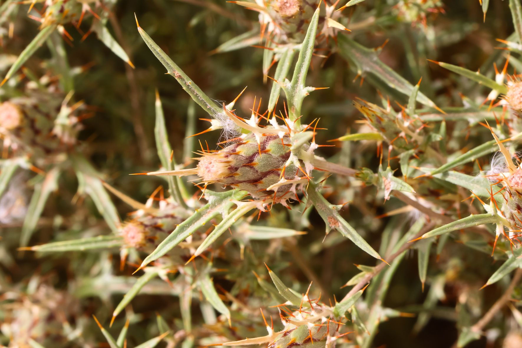 Atractylis delicatula Batt. ex L.Chevall., it is an annual, prostrate or procumbent, slender, adpressed hairy or glabrescent (in older parts), branched from the neck; branches up 10 30 cm long. Basal leaves 60 x 15 mm, oblanceolate in outline, tapered towards the base, pinnalifid, with lobes terminating into a stiff, reddish-brown spine; upper surface glabrous, green, under surface hairy; hairs woolly. Cauline leaves 10-40 x 5-15 mm, sessile, lanceolate, pinnatifid, with lobes terminating into a stiff, reddish spine; upper surface somewhat glabrous, undersurface hairy. Capitula solitary at the ends of branches, discoid, Involucre up to 20 mm long, up to 15 mm in diam, (excl. supplementary involucral bracts). Supplementary involucral bracts sub-2-rowed; supplementary involucral bract of the outer row up to 45 x 10 mm, similar to the leaves, but lobes with 1-3 spine; spines reddish. Supplementary involucral bract of the inner row up to 30 x 5 mm, linear, pinnatifid; lobes with (I-) 2-3 spines; spines reddish. Outermost involucraI bract 7 x3 mm, ovate, acute with tip drawn into a soft, reddish, 1.5 mm long mucro, densely whitish hairy at the back; margins 0.5 mm wide, scarious. Involucral bract of the 2nd row 8 x 4 mm, oblong, acute, with terminal mucro soft, reddish, up to 2 mm long, densely whitish hairy at the back; margins 1 mm wide, scarious. Involucral bract of the 3rd row 9 x 4 mm, broadly ovate-lanceolate, acute with terminal mucro soft, reddish, 1.5-2 mm, densely whitish hairy at the back; margins 1mm wide, scarious. Involucral bract of the 4th row 11 x 5 mm, broadly lanceolate, acute with terminal mucro soft, reddish, 1.5-2 mm long, whitish hairy at the back in the upper half; margins 1.5 mm wide, scarious. Involucral bract of the 5th row 13-14 x 4.5 mm, broadly oblanceolate, acute; with a terminal soft. reddish mucro of 2-2.25 mm long, slightly hairy at the back below the apex, margins 1.5-1.75 mm wide, scarious, hyaline except near the apex with violet spots. Involucre of the 6th row 17 x 4 mm, oblanceolate, acute with a terminal soft, reddish mucro of 2.25 mm, slightly hairy at the back below the apex; margins 1.25 mm wide, scarious with violet spot near the apex. Inner most involucral bract 16 x I mm, linear-subulate, scarious, with margins near the apex ciliate. Corolla up to 14 mm long, tubular, light rosy or whitish in colour. Ovary up to 5 mm long, covered with brown, woolly appressed hairs; hairs partly covering the base of the pappus; pappus setae plumose, 1-rowed, slightly shorter than the corolla.