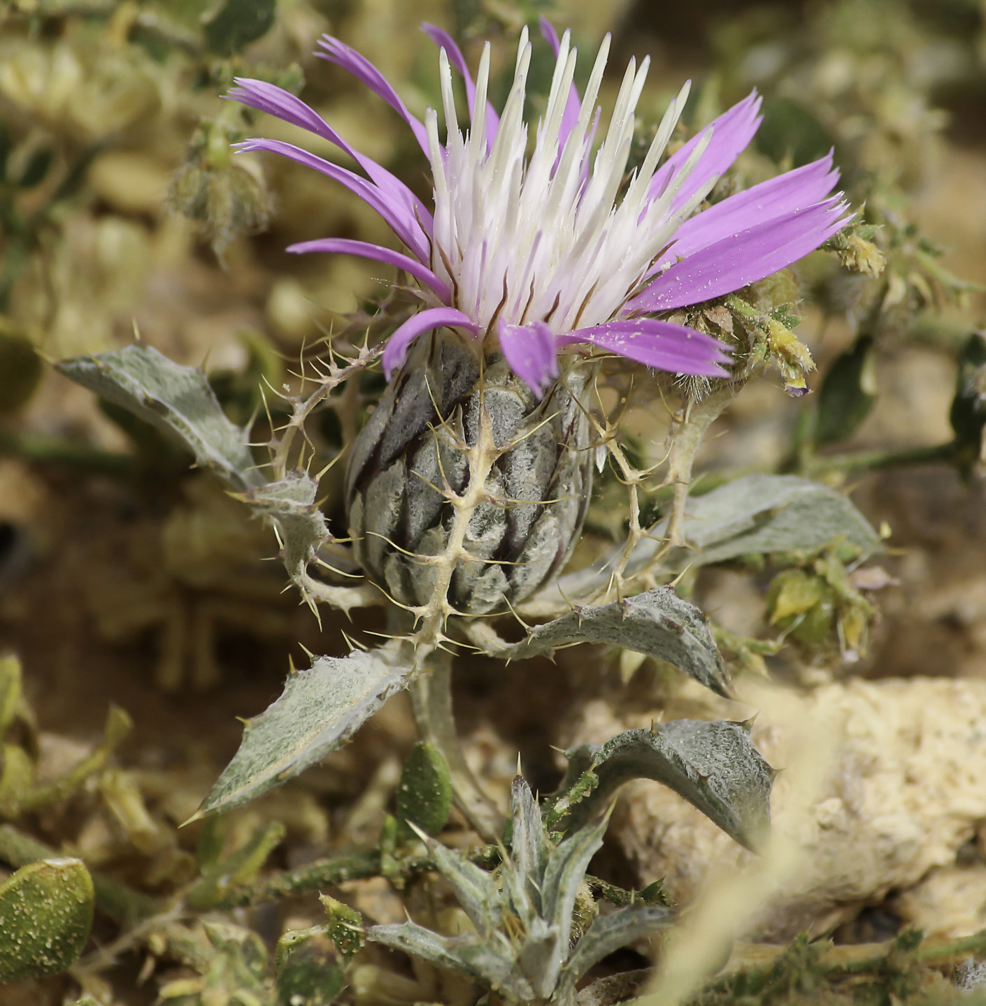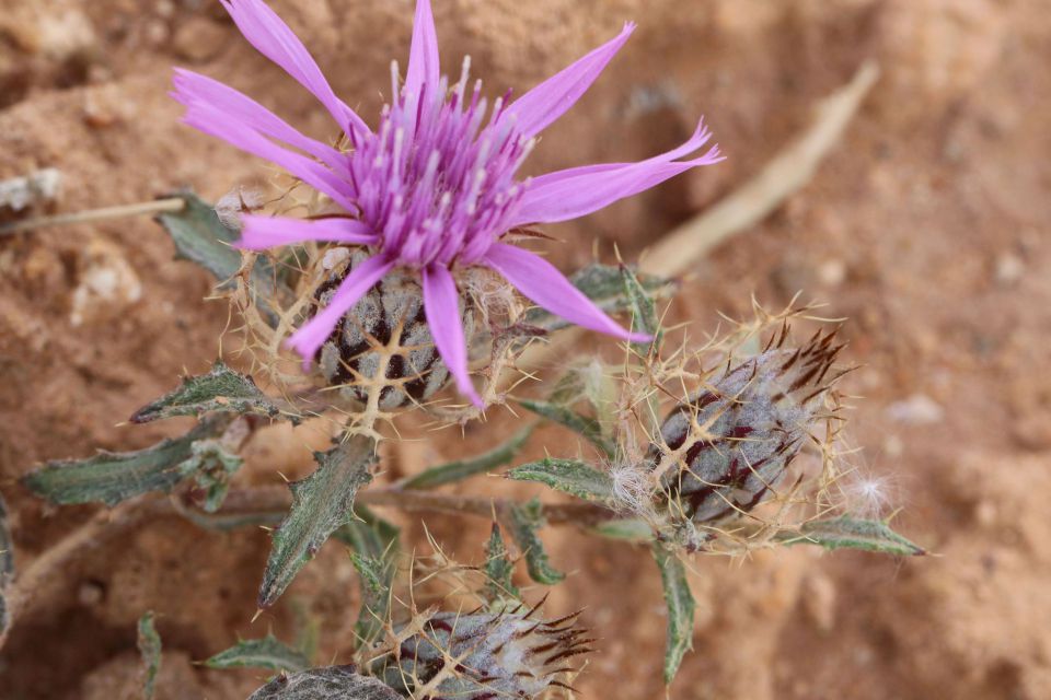 Atractylis prolifera Boiss., it is an annual herb, in general appearance like Atractylis serrata Pomel. from which it differs in having plants smaller and slenderer. The capitula both terminal and in forks of branches. Involucre not more than 10 mm in diam. Ray florets rosy and fwer in number. Disc florets yellowish. Involucral bracts with long, stiff and brown mucro, without any violet spots on the broad, searious margins near the apex.