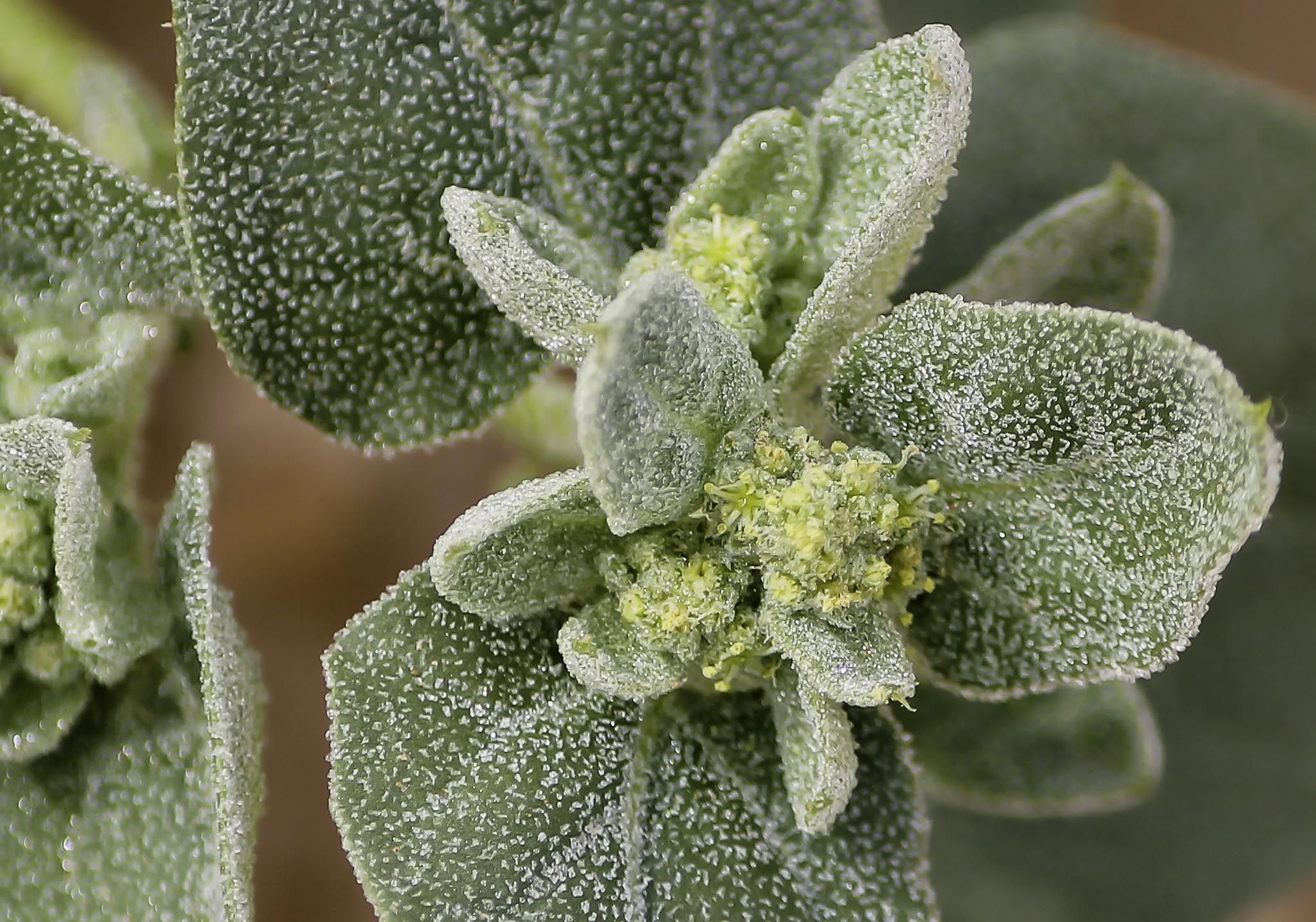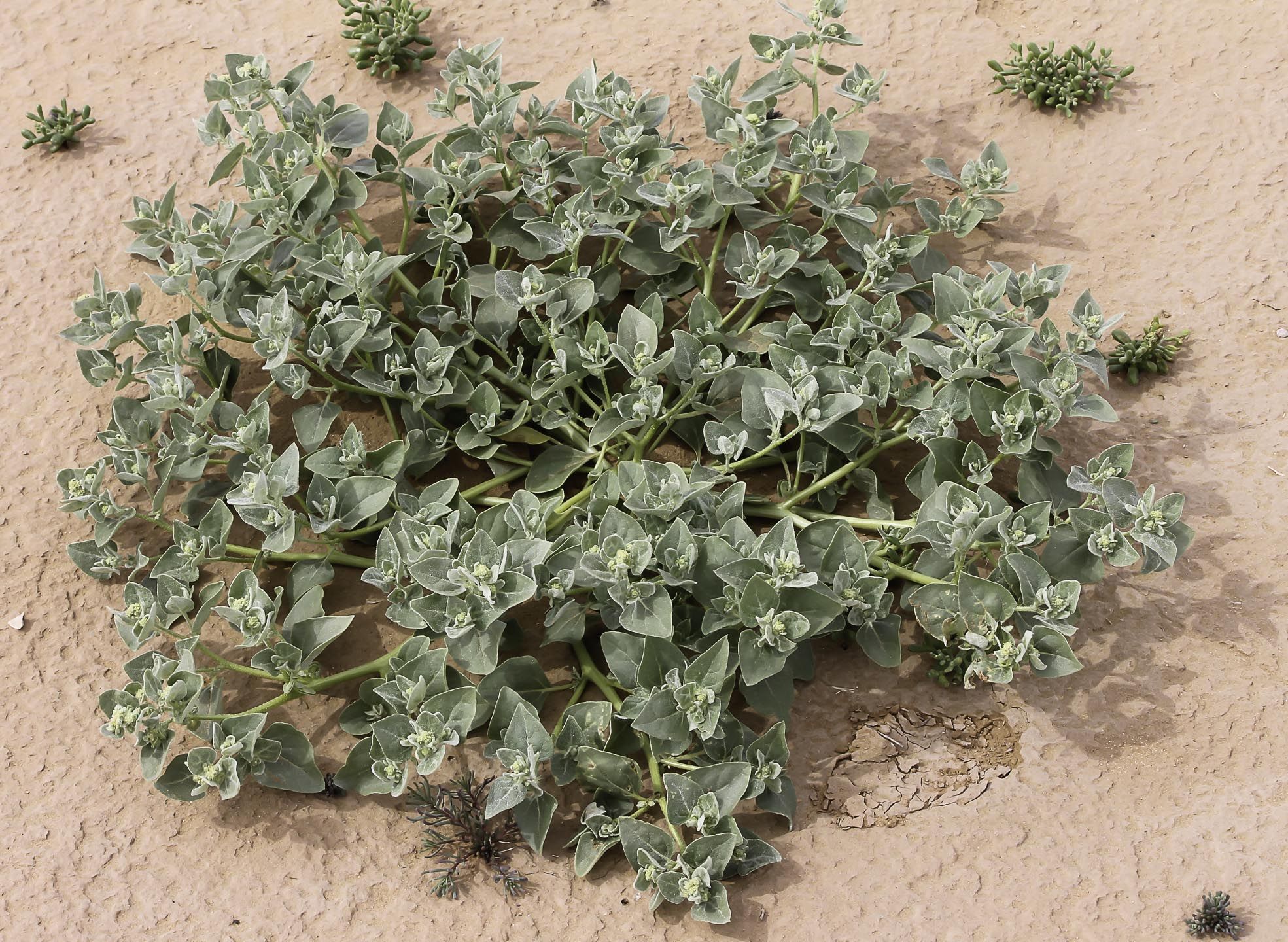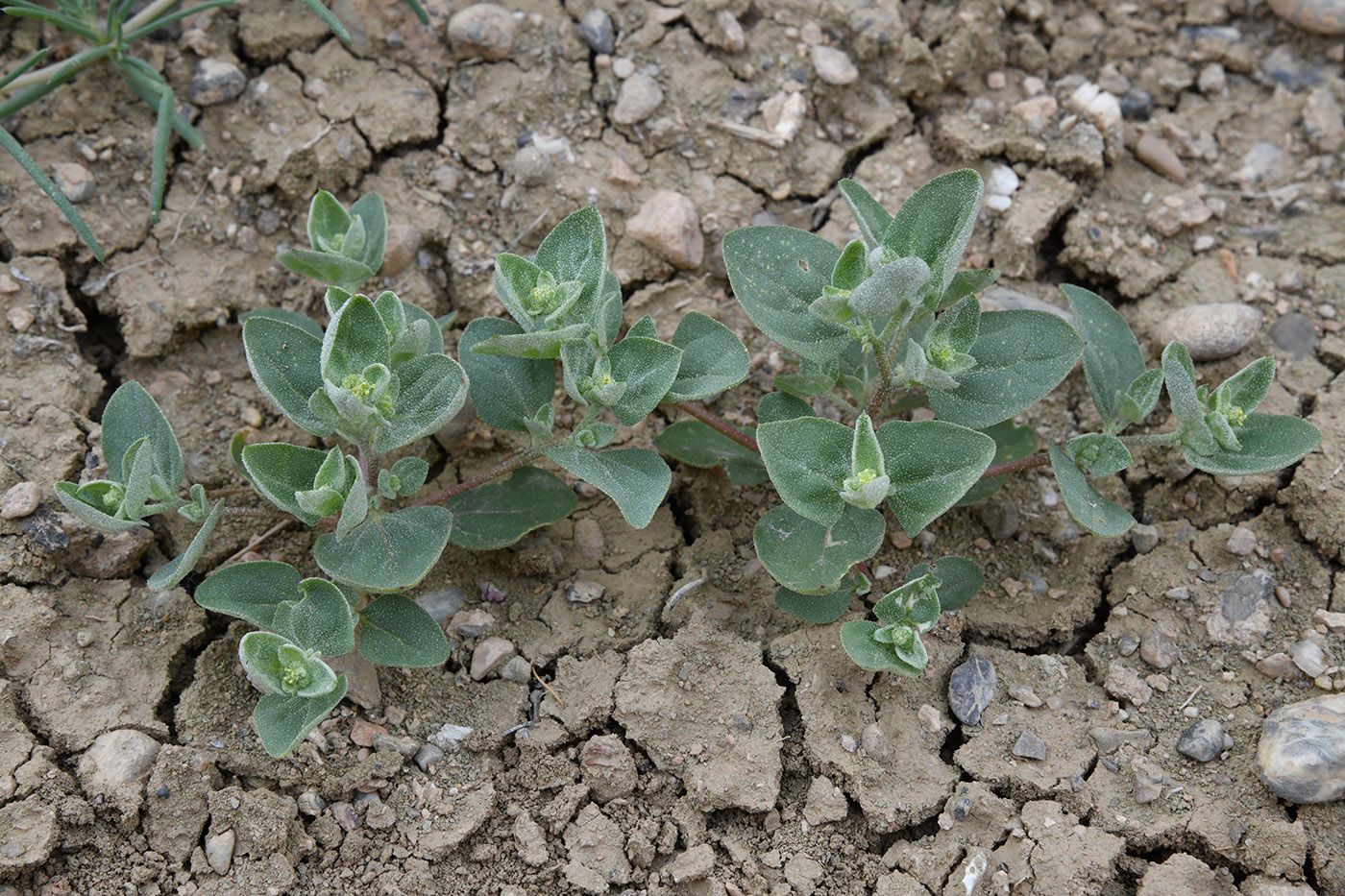 Atriplex dimorphostegia Kar. & Kir., it is an annual, monoecious herb, prostrate to ascending, up to 50 cm long, whitish glabrous. Leaves 10-60 x 10-30 mm, alternate, ovate or deltoid, ± truncate at base, entire to sub-irregularly sinuate-dentate, scurfy-mealy beneath, almost glabrous above. Flower clusters axillary or arranged in terminal spicate inflorescences; lower clusters pistillate, upper ones mixed. Male flowers with 4-5, membranous-yellowish segments; stamens 4-5, pistillode short. Bracteoles of pistillate flowers dimorphic, conspicuously stipitate; those of lower clusters sinuate-lobed, ± smooth; those of upper ones smaller, c. 5 x 3 mm, triangular-ovate with 1-3 teeth on each side, with crested back; stigmas free to base; seeds of 2 sizes; larger ones 2-2.5 mm in diameter, shining dark-brown.