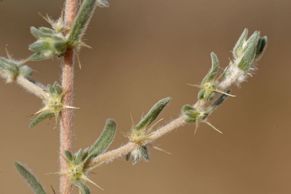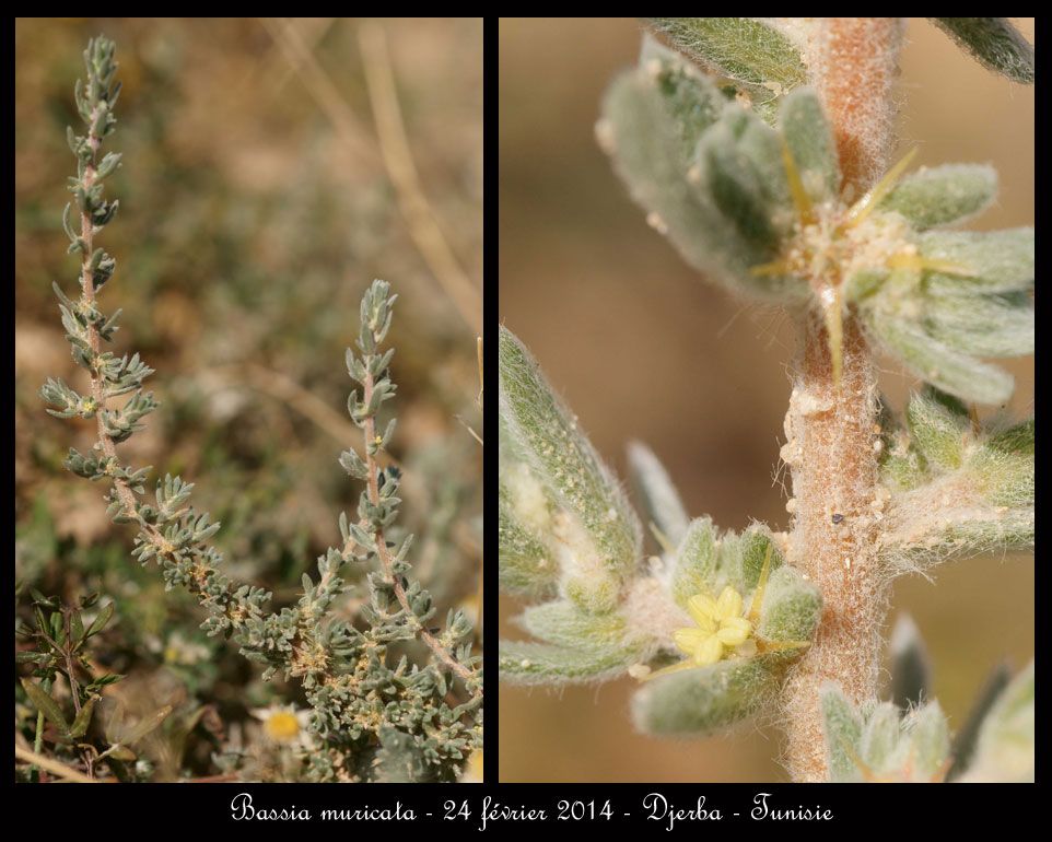 Bassia muricata (L.) Asch., it is an annual herbaceous plant, 15-50 cm tall, erect to ascending, covered with dense, alternate, ribbon-like to lanceolate leaves, 1.5 cm long and 0.2 cm wide. Flowers are single or in axillary clusters covered by the leaves. The fruit is disc-shaped, and when ripe it becomes thorny.