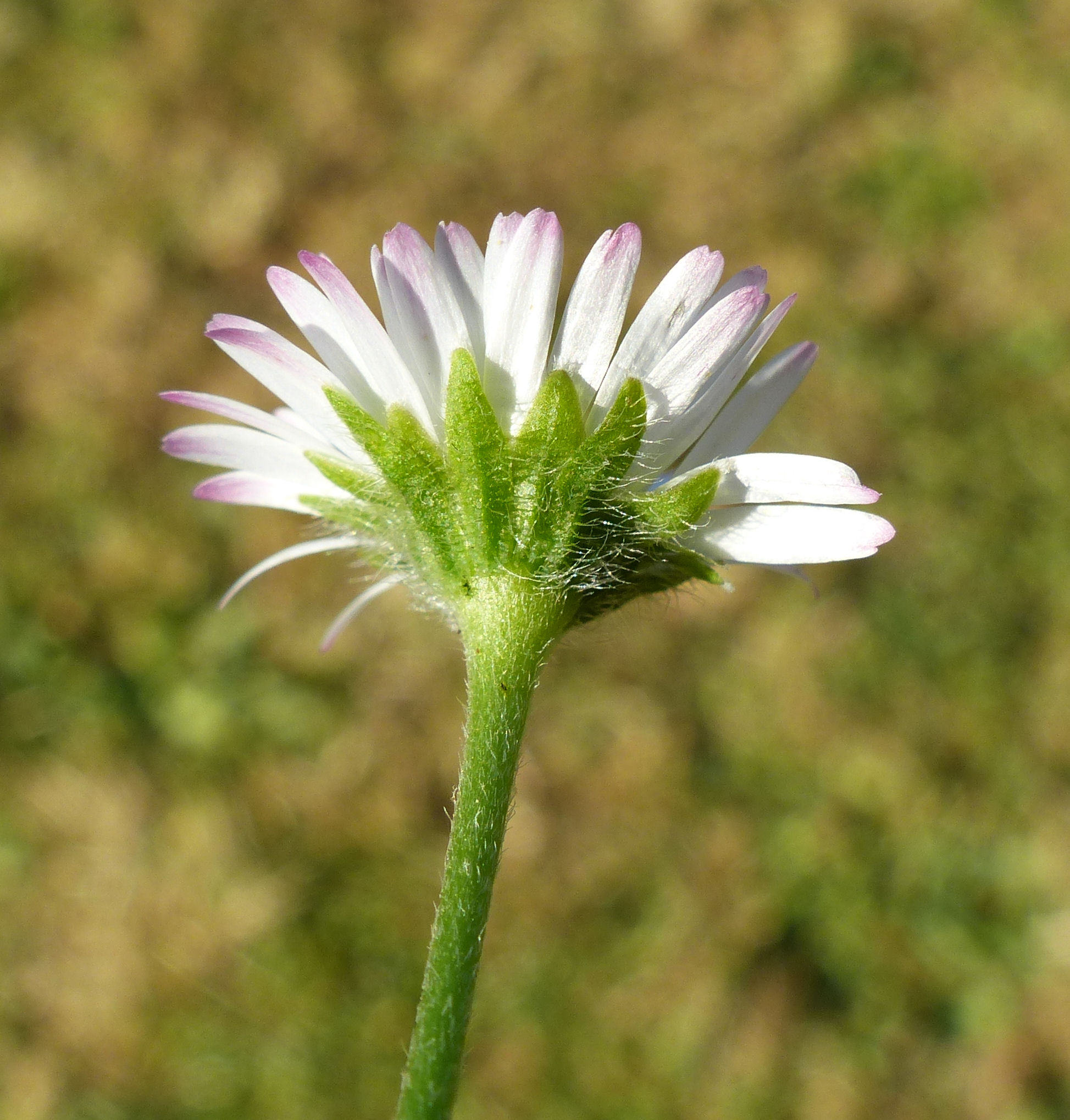 Bellis sylvestris Cirillo / Syn. Bellis sylvestris var sylvestris ̸ Infraspecifics: Bellis sylvestris ssp. sylvestris ̸ Heterotypic Synonyms: Bellis sylvestris var. cyrenaica Bég. it is a perennial, usually scapose. Leaves (15-)30-180 x 5-25 mm, linear-oblong to narrowly obovate, remotely serrate to sub entire, appressed-pubescent at least when young, dark green, 3-veined, narrowed very gradually to a short, scarcely distinct petiole. Peduncles 10-45 cm, stout. Capitula 20-40 mm in diam., receptacle conical to hemispherical. Involucral bracts (5-)7-12 mm, oblong-lanceolate, more or less acute. Ligules 8-14 mm, tinged with purplish-red beneath and often also above. Achenes pubescent, sometimes with a rudimentary pappus of short bristles