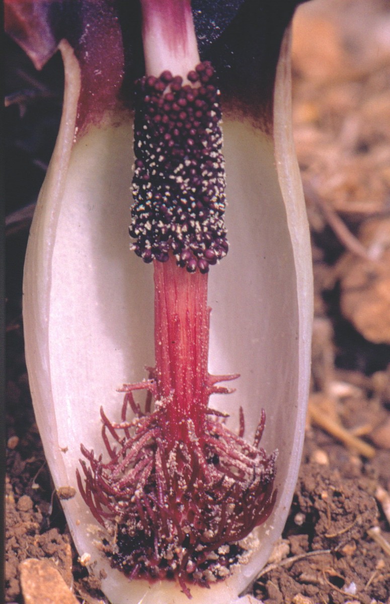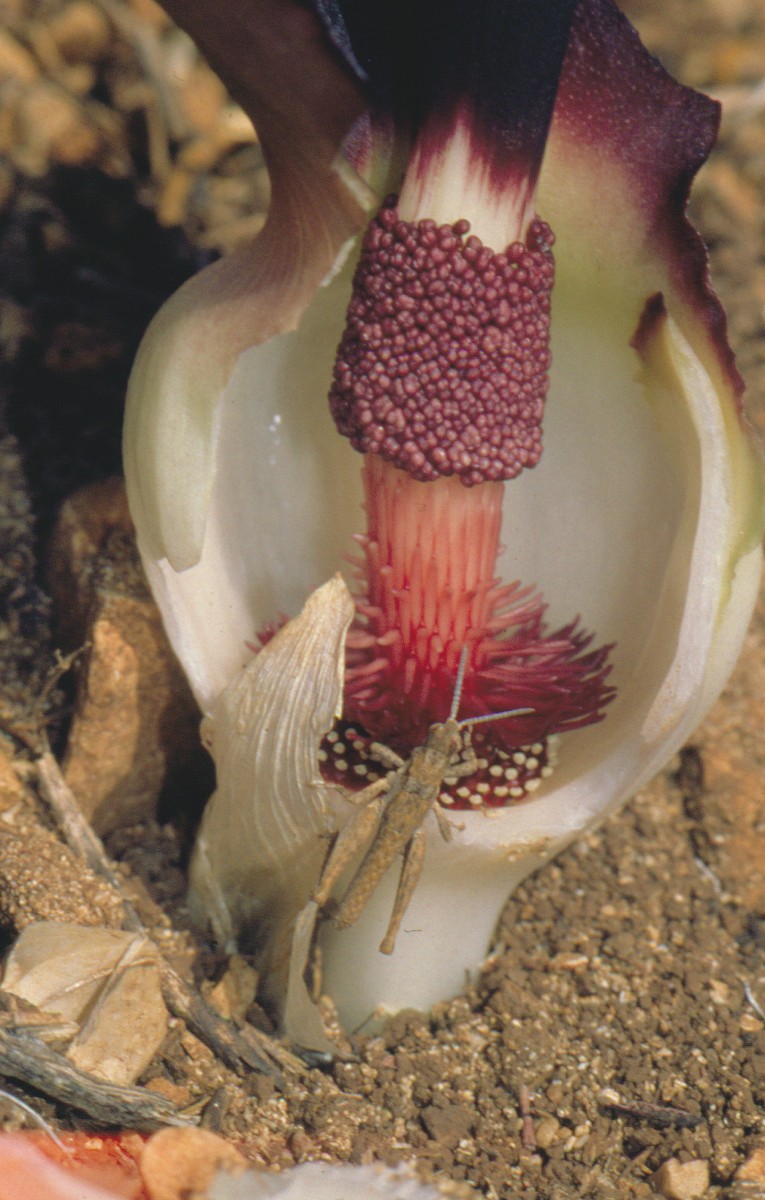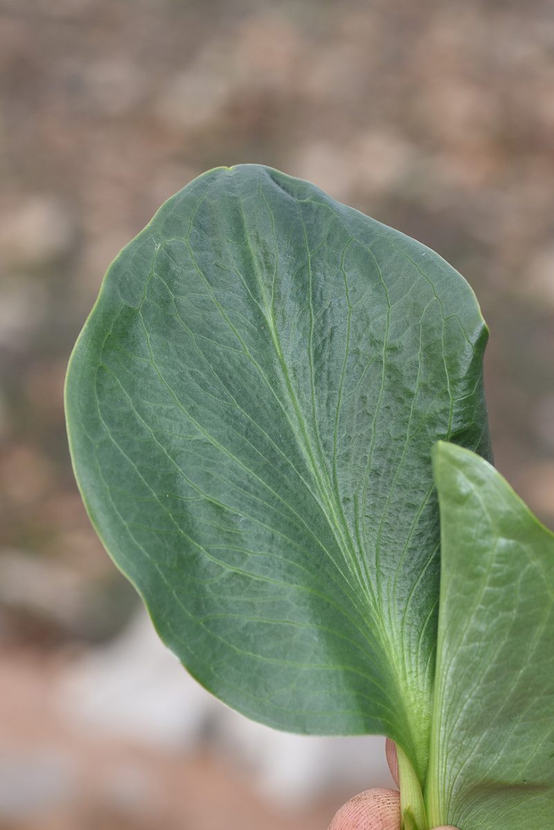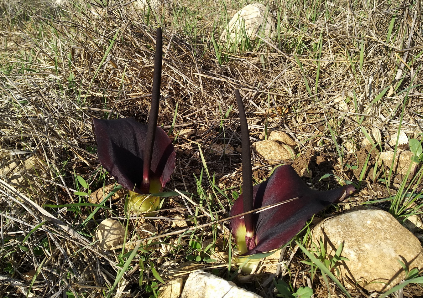 Biarum bovei Blume, it is a geophyte, green cormous herb, up to 30 cm tall; corm sub globular 4-6 cm in diam., rooting from top. Leaves small entire, 5-10 in number, appearing after flowers; blade elliptic-ovate 6-7 x 2.5 cm, equaling to slightly longer than spathe. Scapes 3.5-7 cm long, carrying ± tubular spathe 5-11 cm long, bottom with margins joined together c. 1/4 of the spathe length, spathe usually green outside and brownish inside. Spadix more or less equaling to slightly longer than spathe. Female flowers below, ovaries oblong, unilocular with very short style and capitate stigma. Male flowers usually above and separated from females by sterile zone. Fruit berries; seed obovate.