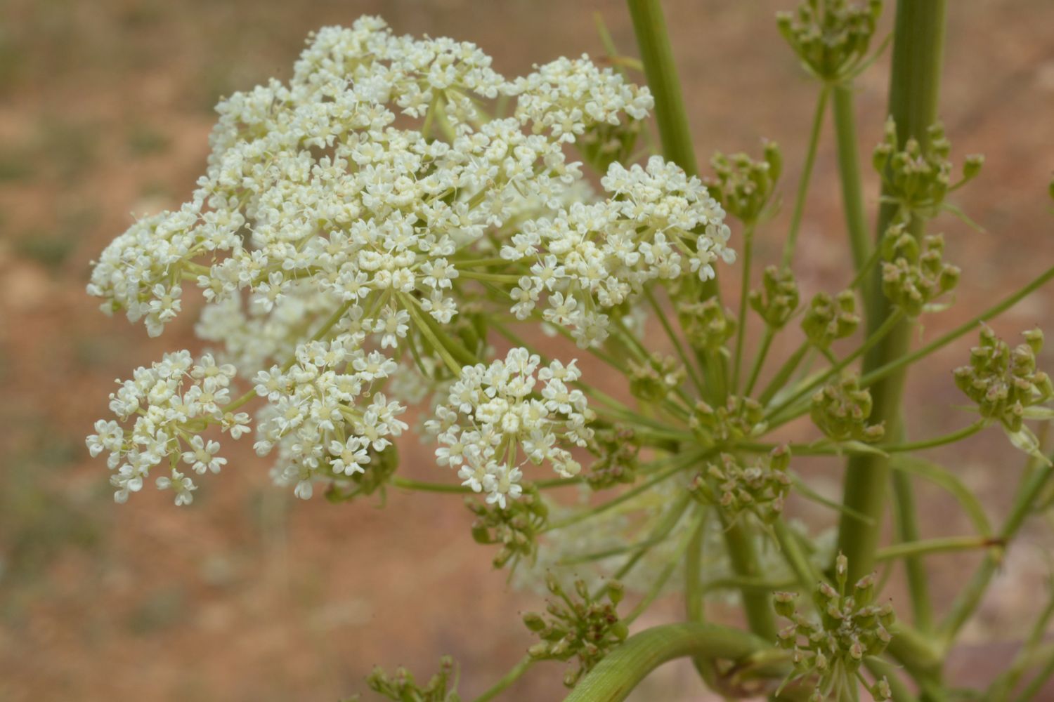 Bunium fontanesii (Pers.) Mair, it is a perennial or biennial with a tuberous, ± globose rootstock, up to 30(-40) cm tall, ± dichotomously branched. Leaves 3-ternate: basal leaves long petioled, sheathing at base, cauline 2-ternate, with linear to linear-lanceolate, mucronate ultimate segments. Bracts and bracteoles 6-9, persistent. Rays 6-9: slender: sepals minute, petals white or cream-coloured, ± orbicular, emarginate with incurved apices. Pedicels up to c. 7 mm long, slender, not thickened in fruit. Fruits oblong-elliptic, c. twice as long as broad, glabrous, with prominent ridges with 1 oil ducts in between; carpophore, somewhat thickened, undivided: stylopodium short, conical, with denexed longer styles.